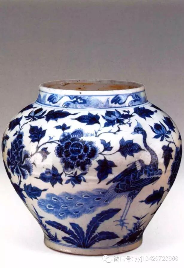 青花孔雀牡丹纹罐 元 高30.2厘米 口径20.3厘米 足径18.4厘米 英国大英博物馆藏