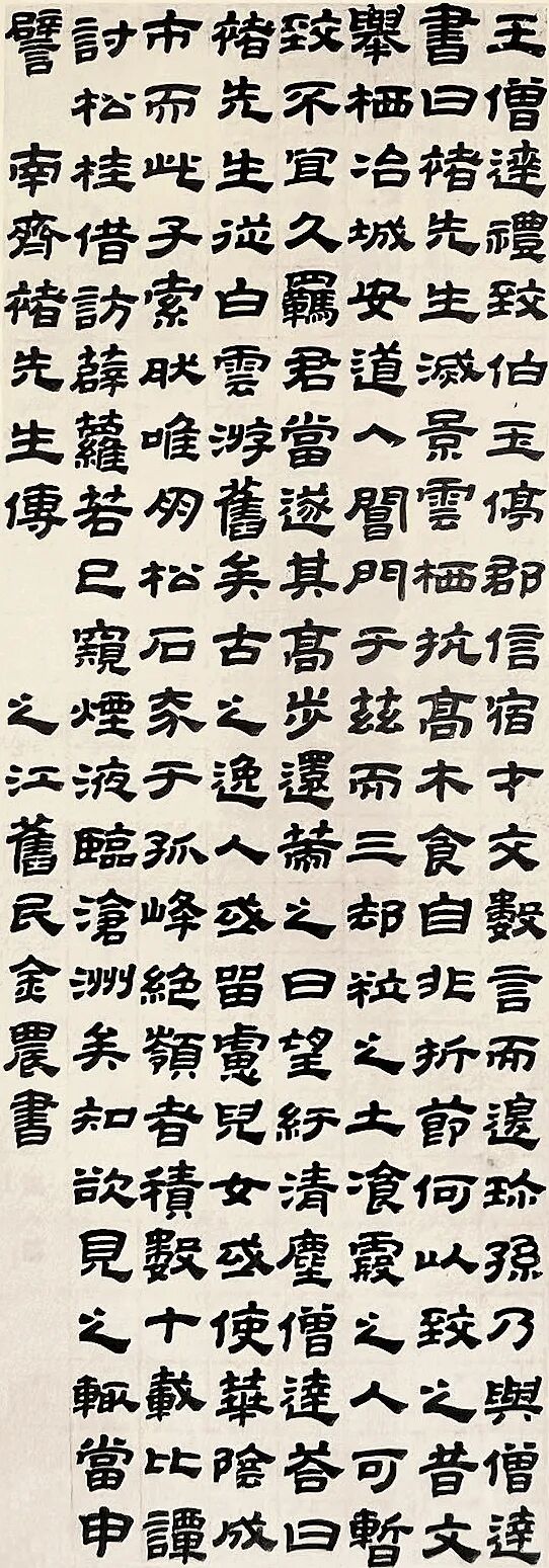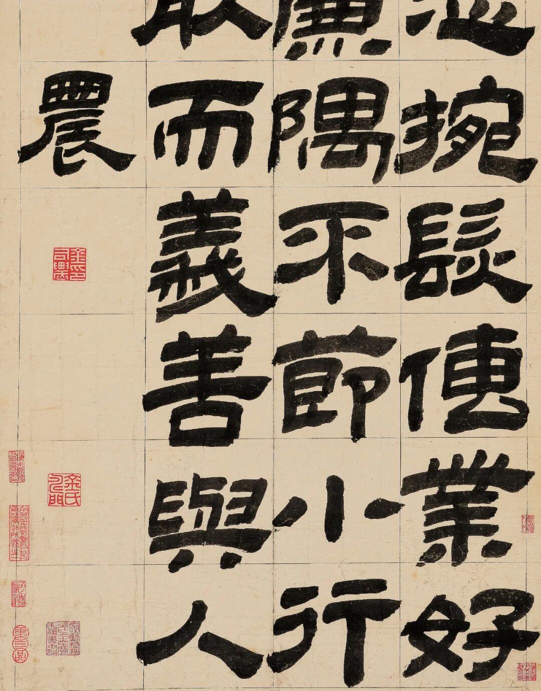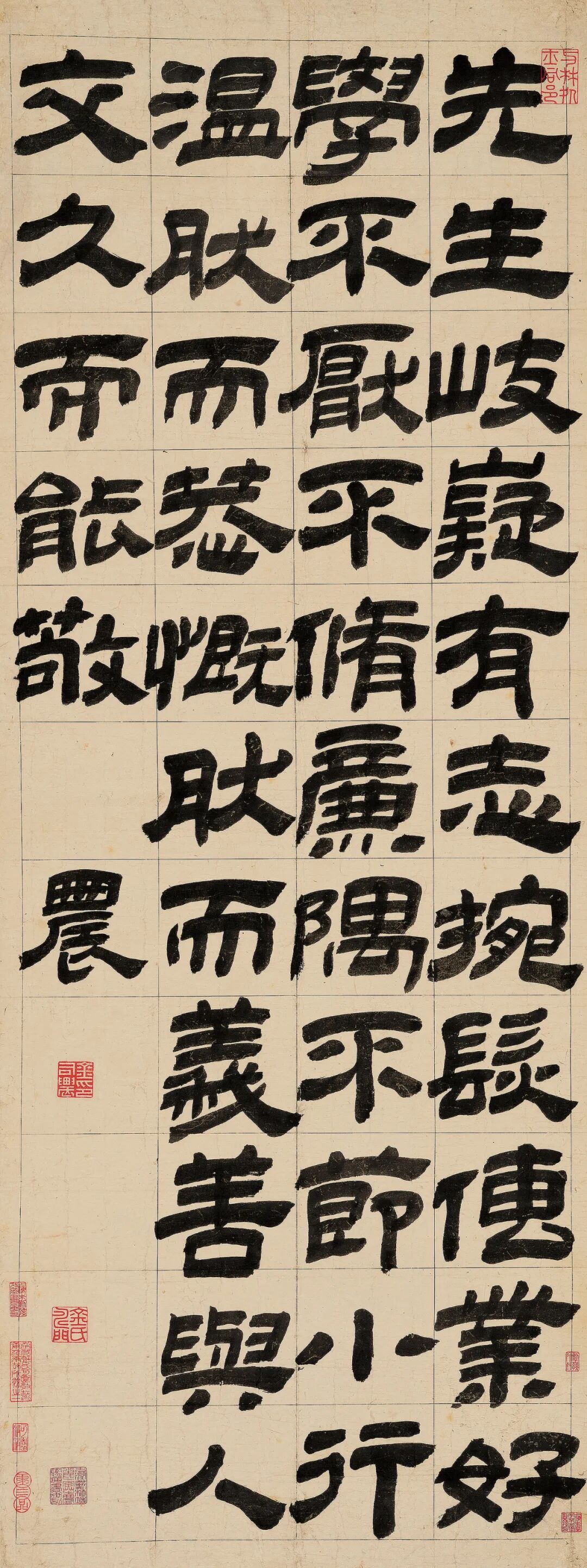 齐渊编《金农书画编年图目》下,第73页,人民美术出版社,2007年。1.娄寿碑,又名“玄儒先生娄寿碑”。东汉熹平三年(174)正月刻,旧在湖北襄阳,历来有名,原石早佚,有宋拓本行于世。碑为隶书,字体方正。3.戴培之(清道光间),名植,江苏镇江人,字培之、芝农,斋名听鹂馆、翰墨轩,富收藏,精鉴别。所藏书画多明清佳制,上海博物馆有其藏品多件。4.张可园即张权(1862-1930),张之洞之子。字君立,号圣可,晚号可园、柳卿、孙卿、均公。直隶(今河北)南皮人。光绪十七年(1891)举人,光绪二十四年(1898)进士,签分户部任职。工书画,精鉴赏收藏,书画甚丰。5.朱棠,字芾甘,号勤荪、近生,浙江吴兴人,张大千弟子,寓居上海。善山水。1941年曾在上海举办个人画展,中国美协会员。“上海朱勤荪收藏书画印”常见于所藏明清书画。金农,原名司农、字寿田,“司农”为汉代“九卿”之一的官称,而“农”则是田间的耕作者。金农21岁时拜在何焯门下就读,其于诗、画、金石考据,均在何义门家的两年里有了很大的收获。金农在何宅心无旁鸯,潜心治学,研读经史及金石碑版,文学与艺术修养都大为提高。同时,年轻的金农常得与好友厉鹗、鲍鉁、丁敬、杭世骏等交游,相互酬唱,亦受益匪浅。自三十岁始,金农开始了“足迹半天下”的“行万里路”之行。之前的金农大多数都是往来于扬州和杭州之间,不断地寻觅其艺术知音,更期盼着展露才情,但早岁的诗名并没为其赢得“际遇”,或许是胸中的干云之志,利禄之念,似是淡化。三十九岁时,由于受泽州陈幼安学士之邀,决定将作山西之途。在此远行之前,北游之始,其本人将“金司农”更名为金农;字也由“寿田”更为“寿门”。金农隶书大致分为四个阶段,其一为三十九岁之前,此时期金农已经于隶书用功多时,遍临诸碑,虽然其时郑簠隶书风靡扬州,但未被时流所囿。其风格以乙瑛碑为主,字型方扁,用墨浓重,提按分明。其二为三十九岁前后至五十岁之间,多以《华山庙碑》为主,且隶书中多见草法,落笔厚重时见飞白,结体紧凑,点画苍劲灵动。第三个阶段是其五十岁至七十岁之间,此时期结体用笔皆呈现出方整之态,横竖笔画粗细一致,隶意渐弱,整体有肃穆苍浑、厚重凝练风格;第四阶段为七十岁之后,即为明显的漆书风格。本作金农节临汉隶《娄寿碑》款书“农”,钤印为“金司农印”、“金氏寿门”,可知为金农三十九岁左右所书。厚实朴茂,浓墨重书,字型扁方,用笔每多偏锋,波磔雁尾跃然有动势,在沉稳古厚之中显出悠雅自若的风神气韵。金农初期隶书并不多见,类似风格如浙江省博物馆藏《隶书节录乙瑛碑》、厦门华侨艺术博物馆藏《隶书南齐褚先生传》,天津市艺术博物馆藏《隶书司马温公语》,辽宁省大连市文物书店藏《隶书钟书阳点易》,仅见数件,故而此作节临汉隶《娄寿碑》尤显可贵。![]()