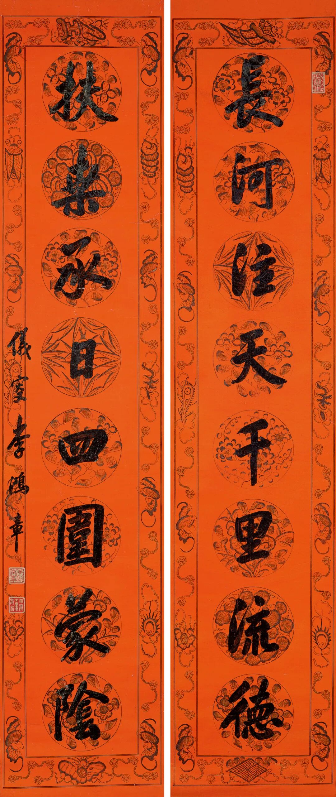 李鸿章《行书八言联》局部此联内容为:长河注天千里流德;扶桑承日四围蒙阴。范晔《后汉书·邓皇后纪》中云:德音流千里,功名重泰山。“千里流德”,即德被千里之意,《汉书·东方朔传》称:“圣帝流德,天下震慑,诸侯宾服”,取意亦同。“扶桑”即传说中的神树名,有时亦作地名。“《海内十洲记·扶桑》:“多生林木,叶如桑。又有椹,树长者二千丈,大二千余围。树两两同根偶生,更相依倚,是以名为扶桑也。”在上古神话中,扶桑为巨大的神木,是日出之地,《淮南子》曰:“日出暘谷,拂于扶桑。”《楚辞》曰:“暾将出兮东方,照吾檻兮扶桑”,亦即此联所云“扶桑承日”之意。这两句联语寓意美德广被天下,功名荫及四方,气魄宏大,足见李鸿章之胸襟格局。本幅尺幅接近两米,在所见李鸿章对联中尤属阔大,同时又书写在手绘的蜡笺纸上,品相接近完美,更觉难得可贵。![]()