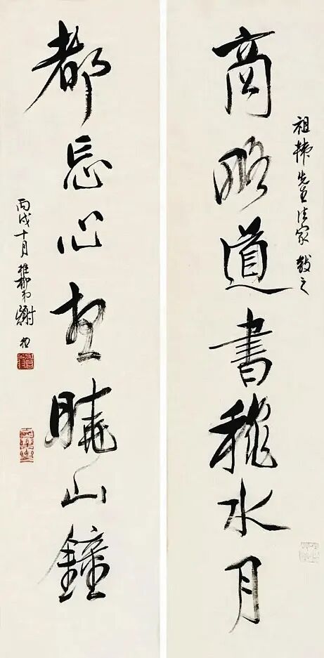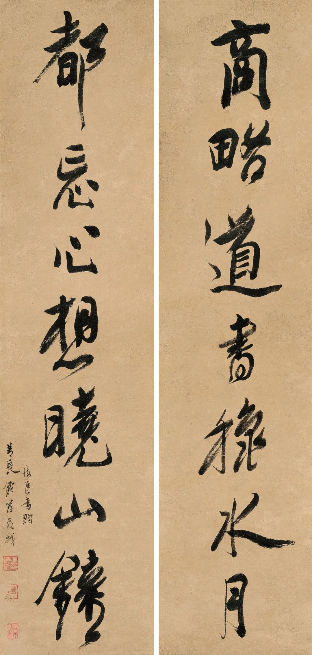 估价:RMB 2,200,000-3,200,000上海博物馆编《中国书画家印鉴款识》,第1053页,文物出版社,1987年。2.上海博物馆1987年编纂《中国书画家印鉴款识》,“陈洪绶”名下第49印“陈洪绶印”即取自本幅。陈洪绶绘画格调古雅,其书亦然。孟远评“撷古诸家之意而自成一体”,吴修云:“章侯书法遒逸。”包世臣称之为“楚调自歌,不谬风雅”而列为“逸品”。陈洪绶《行书七言联》为其晚年所作,也是陈洪绶创作最丰富的时期,款落“悔迟”之号。陈洪绶的名号中,含义最深的便是“悔迟”,这是一种相当复杂的情感。丙戌(1646)夏,陈洪绶避乱山中,也是此时,开始使用“悔迟”“僧悔”等号。孟远撰《陈洪绶传》云:“大兵渡江东,即披剃为僧,更名悔迟,既悔碌碌尘寰致身之不早,而又悔才艺誉名之滋累,即忠孝之思,匡济之怀,交友语言,昔日之皆非也……自披剃后,即不甚书画,不得已应人求乞,辄画观音大士诸佛像,有称其必传不朽者,则曰:是固余之所悔也。”此时陈洪绶逢朝代更替巨变,陷入“英雄无路,报国无门”的困境之中。在明亡后,其孤傲倔强,不为清政府合作,狂放不羁,唯有寄情书画。也正是因其在政治上的遭遇,对陈洪绶的作品风格有着极大的影响,他的作品荒诞而深情,充满怪趣味和真性情。《行书七言联》全联以中锋运笔,纵敛有度,收放自如。结体以长方为体,内敛外拓,兼以陈氏特有的长捺、抛钩,笔随意下,疏落有致,气韵天成。看似随意,其实含蕴着独到之处与毫无造作的自然态势。《行书七言联》为谢稚柳旧藏。1946年,谢稚柳曾临陈洪绶此联赠李祖韩。谢稚柳以古书画鉴定和绘画成就名扬四海,同时也心水书法。其早年书法追随陈洪绶,风格清新飘逸。郑重说:书法方面,谢稚柳的“功力不在绘画之下,可以等量齐观。他的书法和绘画同时进入陈老莲的艺术领域,那一手的老莲体书法,可以乱真,只是个性有所不同。老莲是超逸中带紧蓄,谢稚柳则在清新中带闲适,与他的画互为云蔚。”至1987年,上海博物馆编纂《中国书画家印鉴款识》时,将本幅《行书七言联》中“陈洪绶印”收录其中。