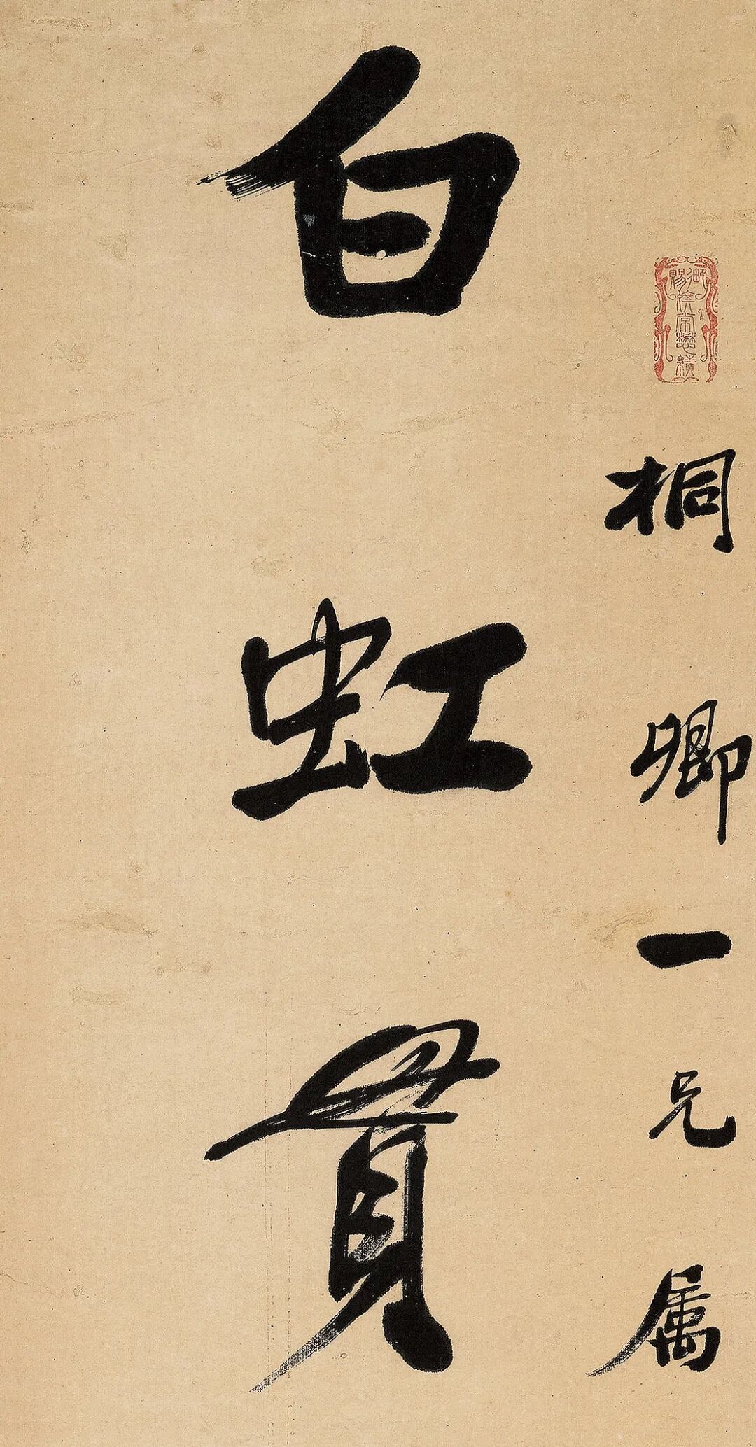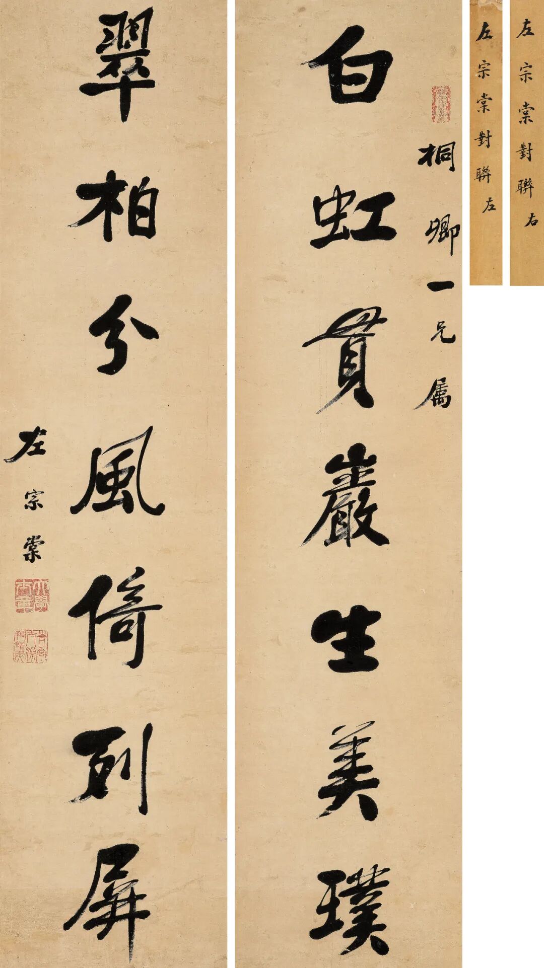 左宗棠(1812-1885)行书七言联作为晚清著名湘军将领、中兴名臣,左宗棠以兴办洋务、平定捻回、收复新疆等巨大功绩而名垂青史。曾国藩言:“论兵战,吾不如左宗棠;为国尽忠,亦以季高为冠。国幸有左宗棠也。”翁同龢言:“其豪迈之气,俯仰一世。又兼通文墨,尤擅书法,崇碑版,篆、隶、行、草兼善,其笔力雄健,风格豪迈,楹联作品为人所爱。”近人马宗霍评价他的书法称:“文襄公行书出清臣(颜真卿)、诚悬(柳公权),北碑亦时凑笔端,故肃然森立、劲中见厚。”此行书七言联中,亦可以看出受到何绍基书法的影响。行书参用篆隶笔意,逆入、涩行,结体宽博左倾,又善用墨法,浓淡相宜,豪迈中不失灵动。上联出自宋代苏舜钦《永叔石月屏图》:“彤霞烁石变灵砂,白虹贯岩生美璞。”下联出自宋代晁冲之《自然诗》:“青松夹日交倾盖,翠柏分风倚列屏。”上联右上角钤“御赐旗常懋绩”双龙纹椭圆形引首章,下联钤“大学士章”白文四字方印和“青宫太保恪靖侯”朱文方印。1874年,左宗棠被授东阁大学士,1878年,左宗棠收复新疆后,清廷嘉其功,诏封二等恪靖侯,故晚年作品常用此套印章。上款人“桐卿一兄”,或为蔡承曾,号桐卿,清咸丰二年(1852年壬子)举人,同治元年(1862年)壬戌科大挑一等(相当于副榜进士),钦加同知衔,分发江西丰城即用知县,历战沙场,待战事平息、功成身退,醉心于诗书理易;其性秉直高洁,皇上屡诏却不为起,自表“孤臣自有丰城剑,遥夜思家向斗边”。蔡氏出身望族,据蔡氏文化网载:惠州蔡屋一门曾出四进士:(第三代)蔡步蟾,乾隆四十八年拔贡,被授“岁进士”;(第五代)蔡应嵩,道光庚子(1840年)恩科举人,丁未科(1847年)进士及第(与李鸿章、沈葆桢同科进士),钦命江西分巡,广饶九南道,署吉南赣宁兵备道,加三级,赏戴蓝翎,诰封通奉大夫(官二品),领按察使衔,督江西军政;(第六代)蔡桐卿咸丰二年中举人官从下五品;(第七代)蔡国鑫光绪末年会试贡生(进士)官从七品。1864年7月,太平天国都城天京陷落后,左宗棠节制江西、广东、福建三省,奉命清剿太平军李世贤、汪海洋等残部。二十余年后,位极人臣的左宗棠为曾经的部将写下此联,当年沙场征战的激烈回忆,也已化作了纸上山水畅怀、云淡风轻的诗句。