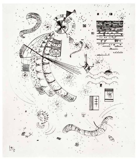康定斯基从小就对音乐感兴趣,少年时即学习过钢琴、大提琴,这为他之后将音乐与绘画相结合打下了基础。他尝试将两种独立的艺术门类进行关联,让绘画中的点、线、面、色彩结合音乐中的音色、乐器、音符,互相缠绕、渗透,以此来通过画面表现音乐,使整个画面达到一种音乐上的和谐美。