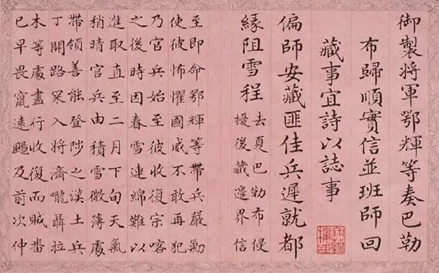 乾隆书法从学习赵孟頫入手,心慕手追,身体力行。游览名胜每到一处,作诗纪胜,御书刻石,其书圆润秀发,在宫中、御园、名胜古迹、寺庙等处,几乎到处可见其墨迹,至今海内保存乾隆御题碑刻甚多。
