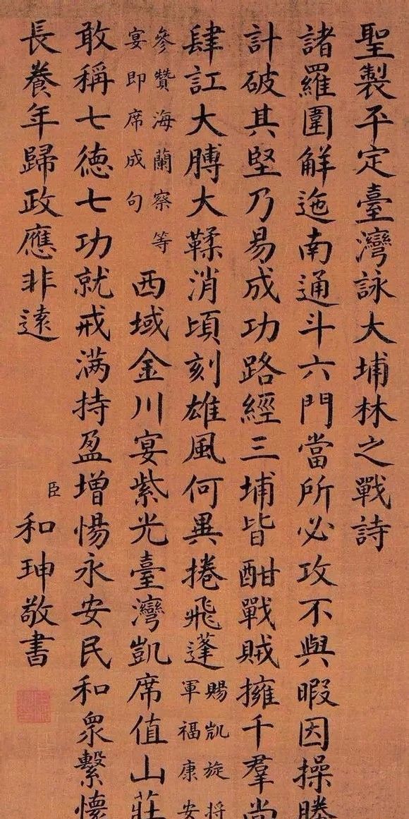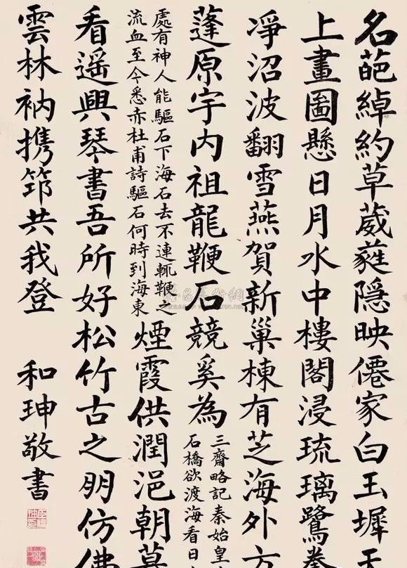 历代书法评价中,书品和人品是一个血肉相连的整体,人品历来高于书品,所谓因人废字。乾隆爱书法,和珅刻意摹仿乾隆的书法,他写的字酷似乾隆的御笔,乾隆后期有些诗匾题字,干脆交由和珅代笔,从中可以看出和珅书法之造诣。