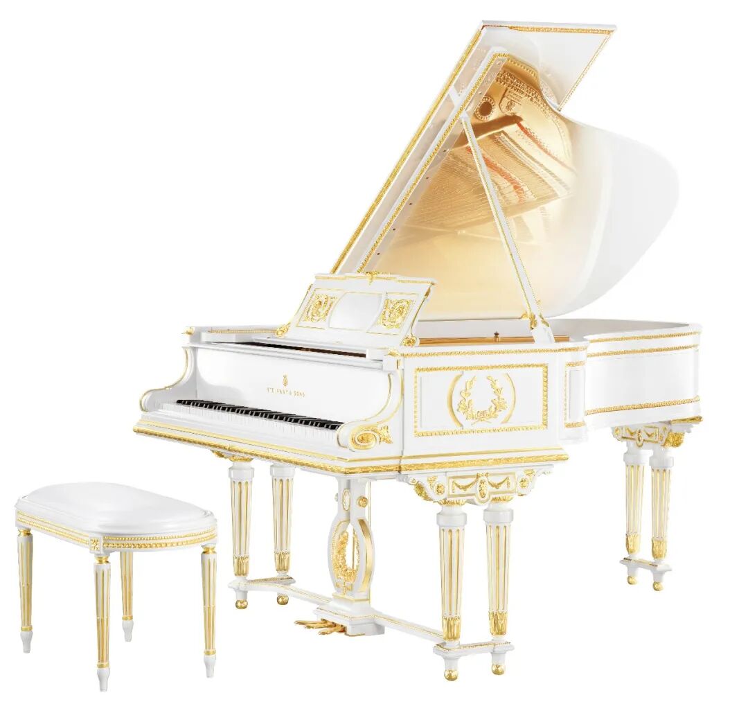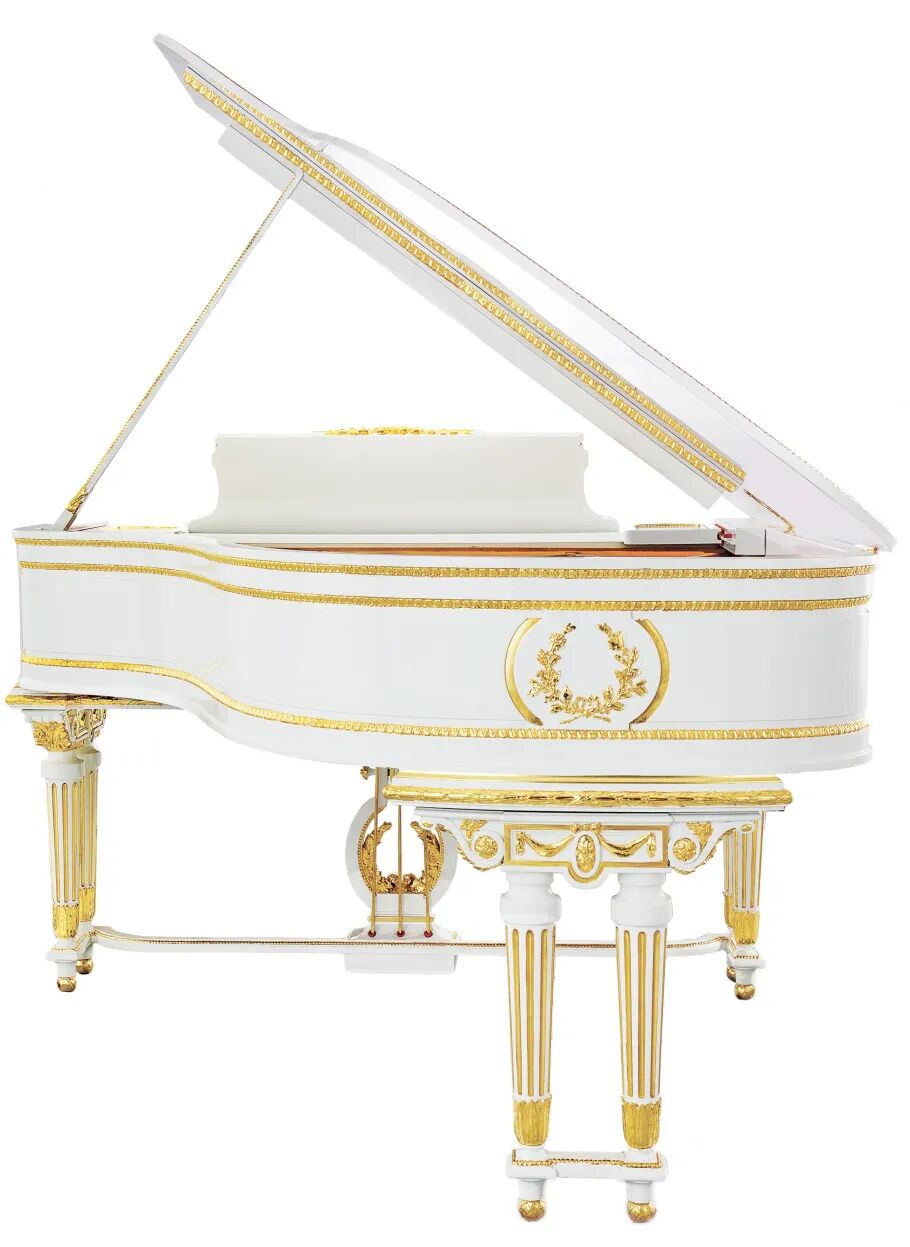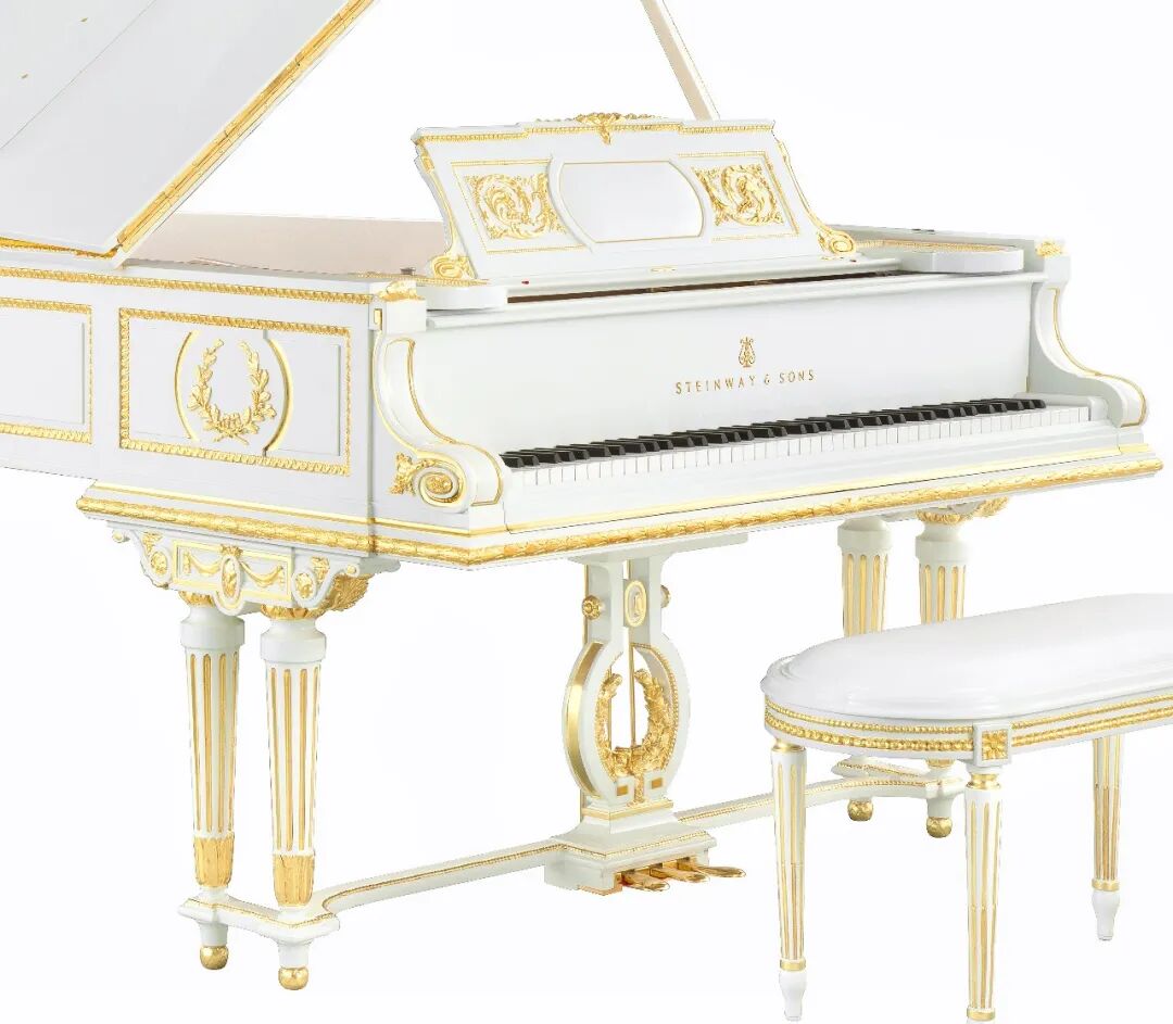 此款24K金路易十六风格白色施坦威钢琴是以法国国王路易十六世命名的,是特制的宫廷级别超豪华钢琴,纯手工雕刻工艺精湛、华丽富贵。钢琴琴体表面突起处的配有带枝花叶、花垂饰和金雕饰的图案,优美别致,充满了法国新古典艺术之美的独特趣味。