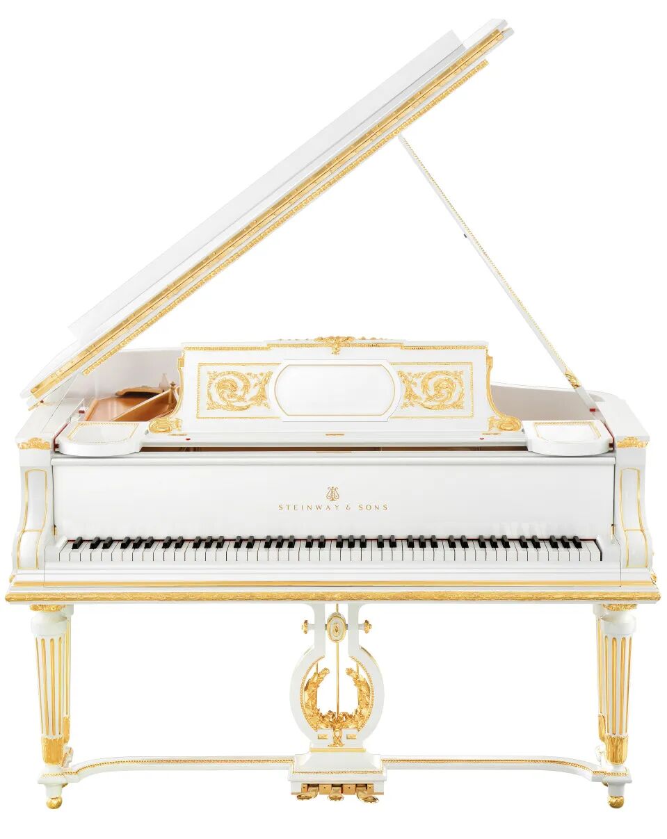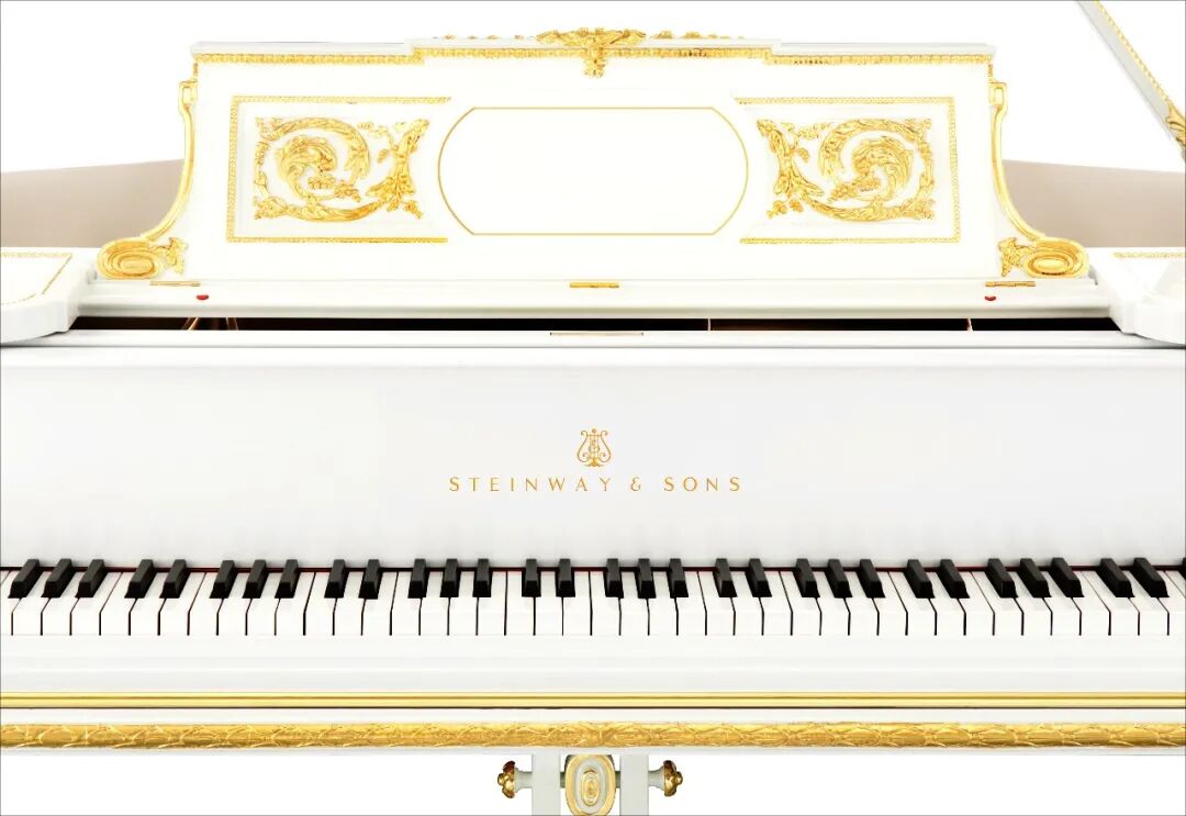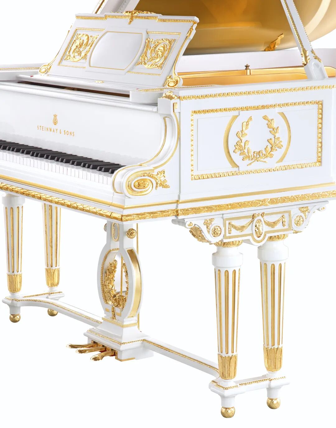 此款24K金路易十六风格白色施坦威钢琴是以法国国王路易十六世命名的,是特制的宫廷级别超豪华钢琴,纯手工雕刻工艺精湛、华丽富贵。钢琴琴体表面突起处的配有带枝花叶、花垂饰和金雕饰的图案,优美别致,充满了法国新古典艺术之美的独特趣味。