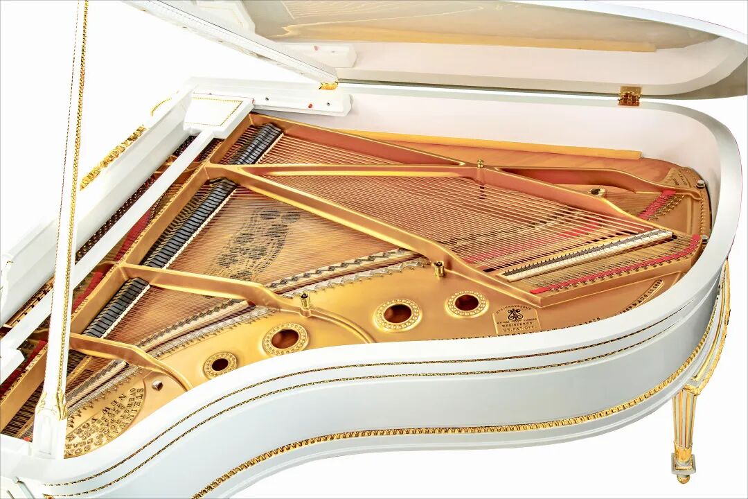 该钢琴的每个琴角都有两条雕刻精美的科林斯柱式凹槽鎏金琴腿,小竖琴形状的钢琴踏板,轮廓线条漂亮,是精美的雕饰艺术品。钢琴主体的白色配搭24K金黄辉映融合、高贵典雅 。当我们欣赏这件不同质感交织的艺术钢琴时,都会情不自禁地为之心动。