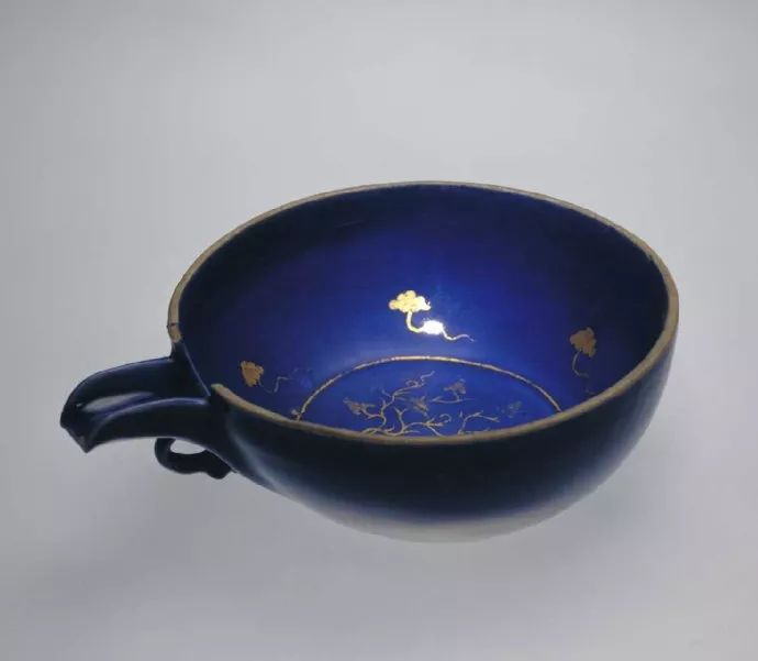 该器造型模仿青铜匜,蓝釉闪烁着宝石蓝般的光泽,配以熠熠生辉的金彩,光彩夺目。这件蓝釉描金匜1964年出土于河北保定窖藏,同时出土的还有蓝釉描金小杯和盘。此匜的金色花纹丝毫无损,光艳如新,实属罕见(参见河北省博物馆:《保定市发现一批元代瓷器》,《文物》1965年第2期)