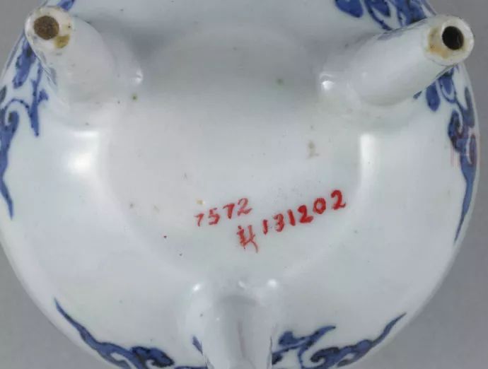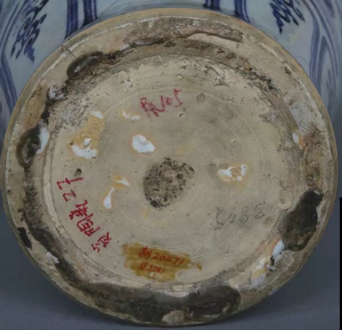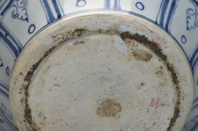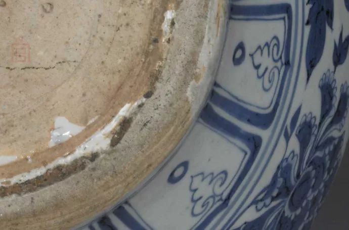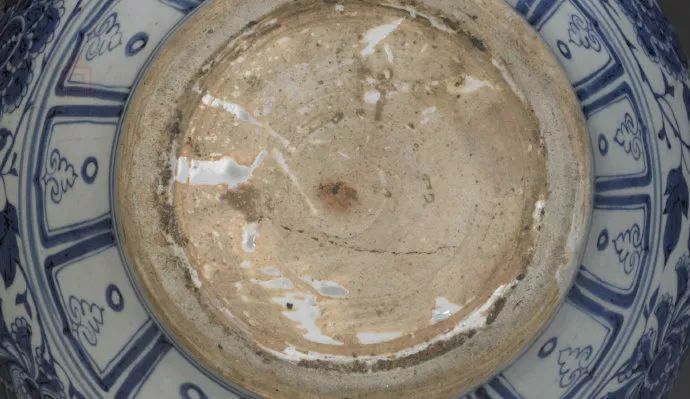 此器青花发色深暗,铁锈斑突出。仰莲瓣纹的瓣尖较尖,莲瓣互不相连,明显具有元代瓷器上“八大码”的时代特征。