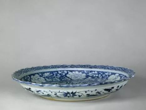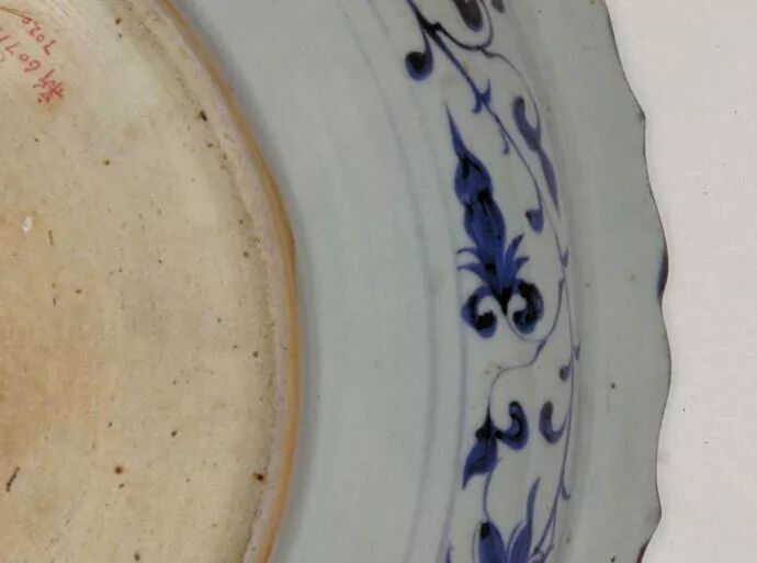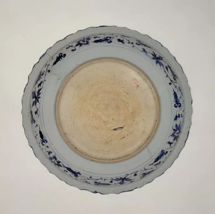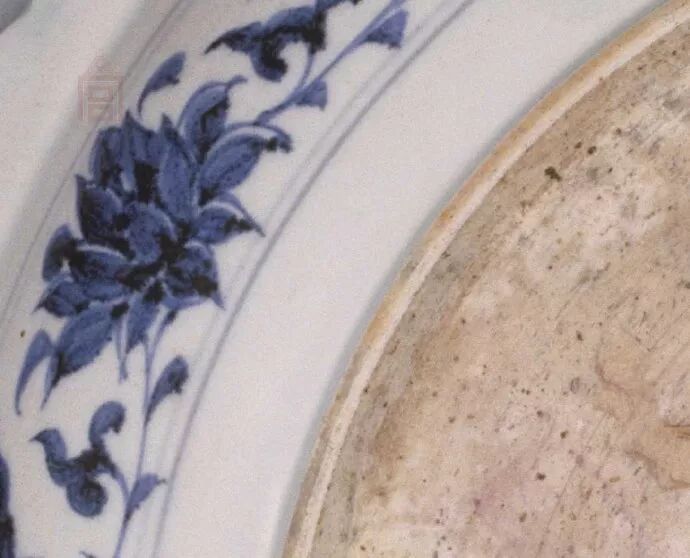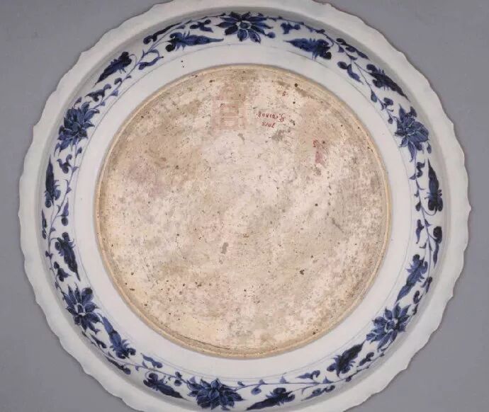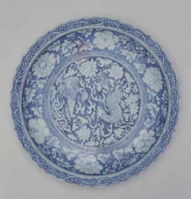 此器青花发色纯正,构图严谨。盘心纹饰寓意“威凤祥麟”以示天地祥和。元代青花瓷器装饰有两种形式:一种是以青花料直接在白色胎体上描绘纹饰。另一种是以青花为地,衬托白色花纹。这种装饰形式始于元代。留白纹饰都有凸起。此盘即为蓝地白花器之代表作。