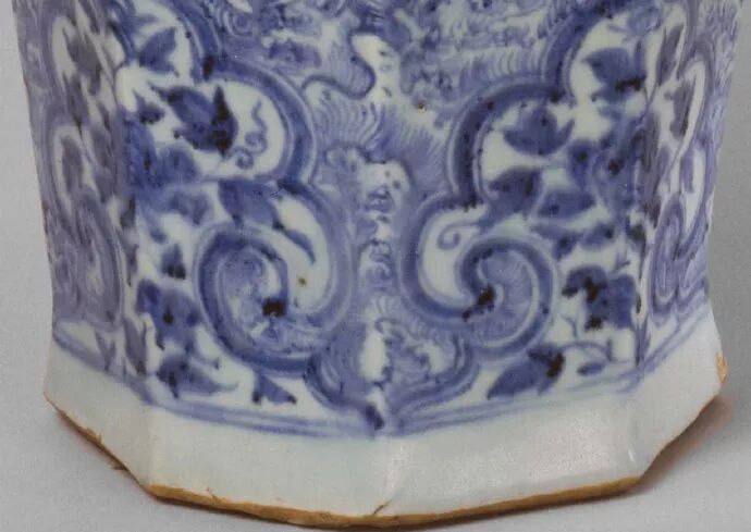 这件青花罐造型饱满庄重。青花色调明艳,呈宝石蓝色而带黑色斑点,表明使用的是外来青料。画笔流畅,构图繁而不乱,每层纹饰之间因有弦纹相隔,既突出了主题图案,又增加了画面的层次感。