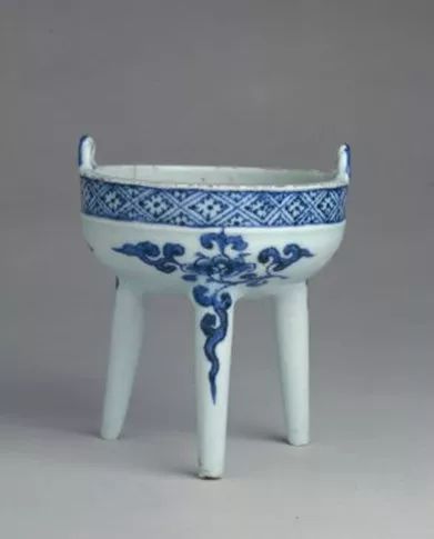 鼎直口,口沿上对称置双耳,浅腹,圜(huán音环)底,下承以三柱状足。通体内外施青白色釉。腹中间凸起弦纹一道。外口下绘青花菱形锦纹,下腹及足绘青花折枝花纹,青花发色艳丽。
