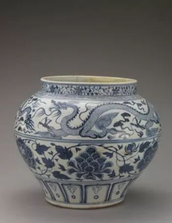 此器是元代瓷器中的大型酒器,胎骨细腻洁白,釉质滋润透亮,青花色泽浓艳。元代的青花瓷器造型硕大丰满,纹饰繁密,层次丰富,构图严谨,一改唐宋以来瓷器花纹布局疏简的传统,工细的描绘加上繁复的层次,形成了花团锦簇的艺术风格。器肩与近足处硕大的青花云头纹借鉴了元代丝织品披肩的图案,龙纹的出现显著增多也是这一时期瓷器装饰艺术的特点。