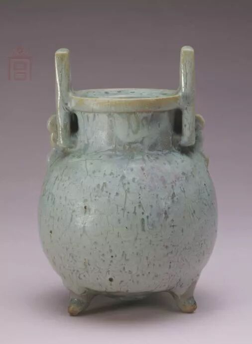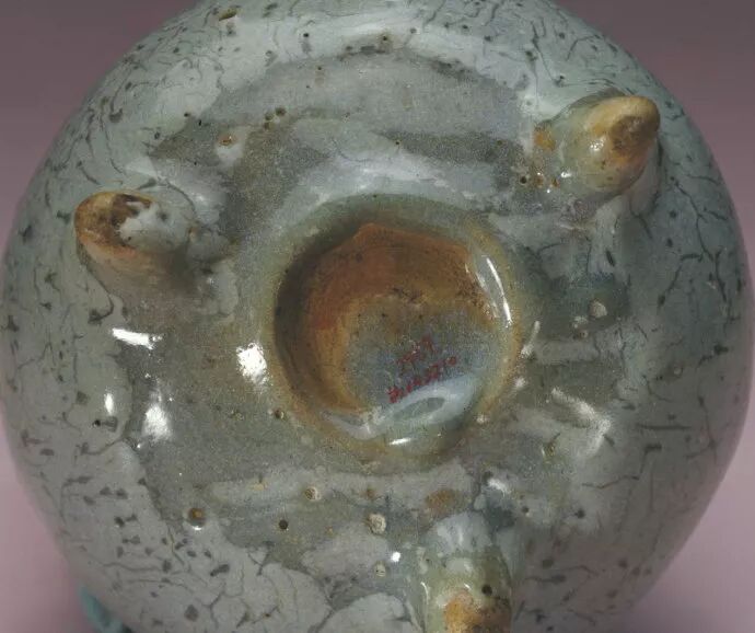 炉方唇,短颈,长圆腹,圜(huán 音环)底,底下有内凹的脐心,下承以三乳状足,足外撇。肩部对称置双耳。釉色青灰,饰紫红色斑,釉垂流现象及“蚯蚓走泥”纹均较明显,釉层中气泡爆裂较多。凸棱及釉薄处呈浅褐色。内壁釉层开片较多,玻璃质感较强。