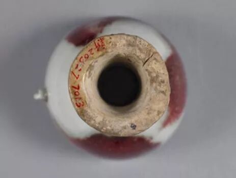 此瓶造型挺拔清秀,红釉鲜艳而晕散,呈现出元代早期的特点。