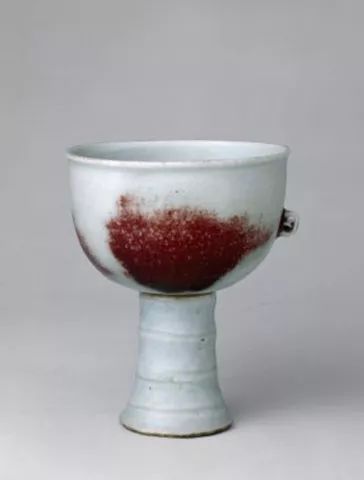 杯撇口,深腹,瘦底,下承以中空竹节式高足。通体施青白釉。杯身涂抹3块釉里红斑,并置一小圆系,杯底和高足以子母榫相衔接,可以自由转动而不脱开。