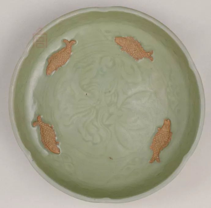 洗口呈花瓣形,腹较浅,坦底。外底正中有脐心内凹。胎体厚重。内外施青釉。外底一环行区域内不施釉,脐心施青釉。外壁刻凸弦纹两道。洗内用刻划技法装饰水波纹、莲花纹,并贴有模印的四鱼纹。