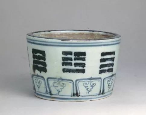 炉筒形,方唇,直口,斜壁,口径略大于底径。胎细白。内壁近口缘处、口沿及外壁施釉,釉层温润,微泛白。沿部青料满铺。外壁近口沿处与近底处各绘青花弦纹两道,腹部绘青花八卦纹、仰莲瓣纹。