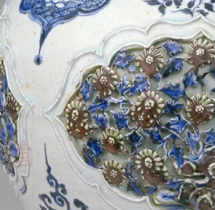 此罐1965年出土于河北省保定市元代窖藏(参见河北省博物馆:《保定市发现一批元代瓷器》,《文物》1965年第2期)。造型丰满浑厚,纹饰层次鲜明,综合了绘、镂、塑、贴等多种技法,特别是镂花装饰在元代瓷器上较少见。青花、釉里红在作品中互为衬托,红、蓝交相辉映,整体形成一种气度雍容而又花团锦簇的艺术效果。