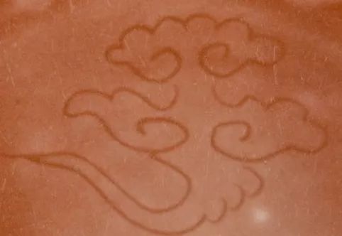 盘撇口,浅弧腹,圈足。足墙内外均斜削。内壁模印云龙纹,龙五爪。盘心刻划三朵“品”字形排列的云纹。胎细白。内外均施红釉,口沿及纹样凸起处釉层较薄,隐现白色胎骨。圈足内无釉。