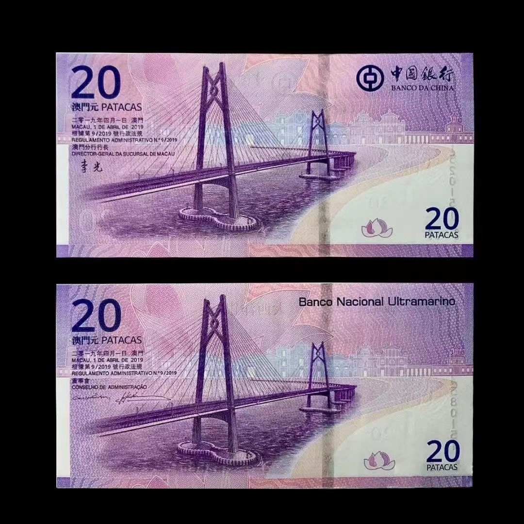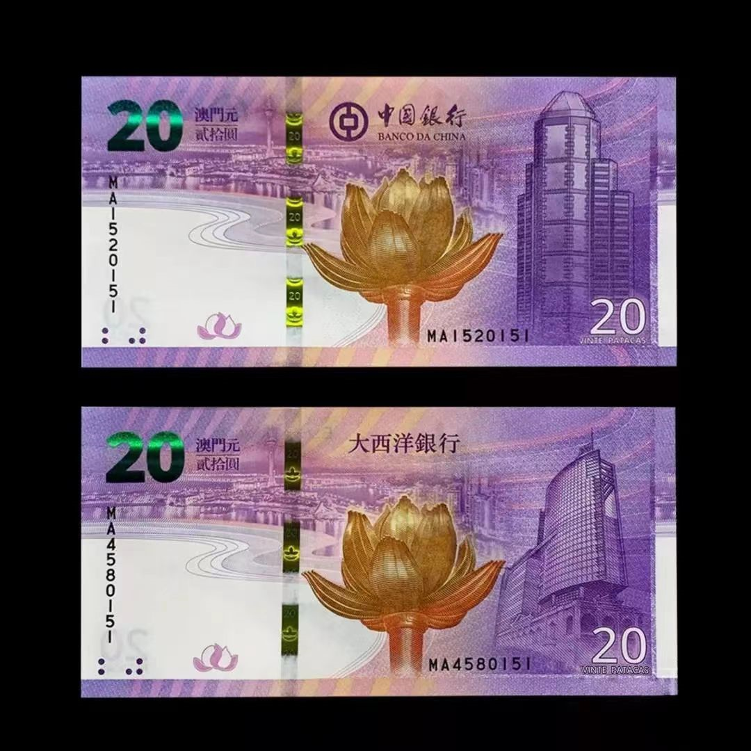 澳门回归20周年纪念钞,由中国银行澳门分行、大西洋银行澳门分行各自发行一张,组成一对。