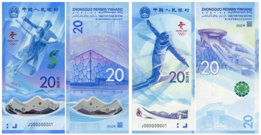 央行发行的首套对钞,一套两张,冰上运动为塑料钞,雪上运动为纸钞。