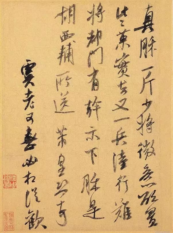 释文:真(月禾)一斤,少将微意,欲置些果实去,又一兵陆行难将。都门有干示下,是胡西辅所送。芾皇恐顿首。虞老可喜,必相从欢 。