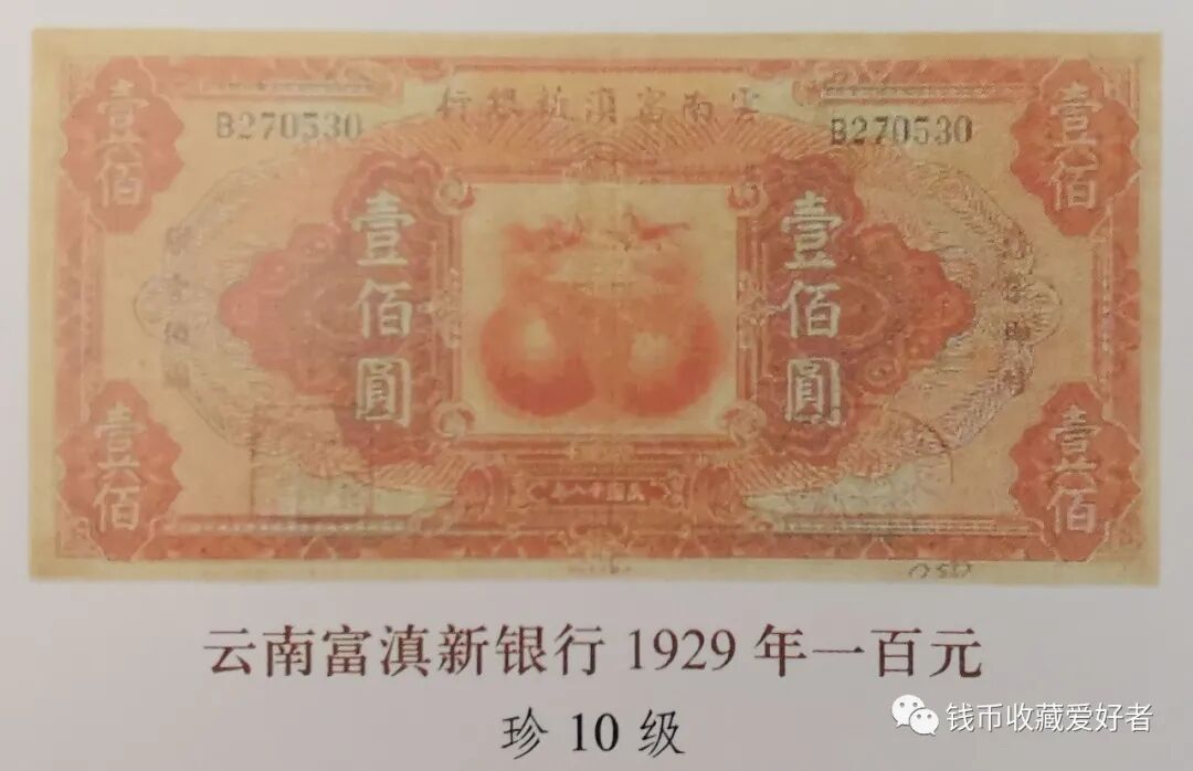云南富滇银行成立1912年(民国元年)二月。初期发行1912年版纸币,后发行1913年版纸币。早期纸币因收兑比较彻底,存世稀少。以后大量发行的是由美国钞票公司印制的1921年版,面额为一元、五元、十元、五十元、一百元的五种主币券和一角、二角及半元辅币券。随后又发行当地印刷的1927年、1929年两版主币券。