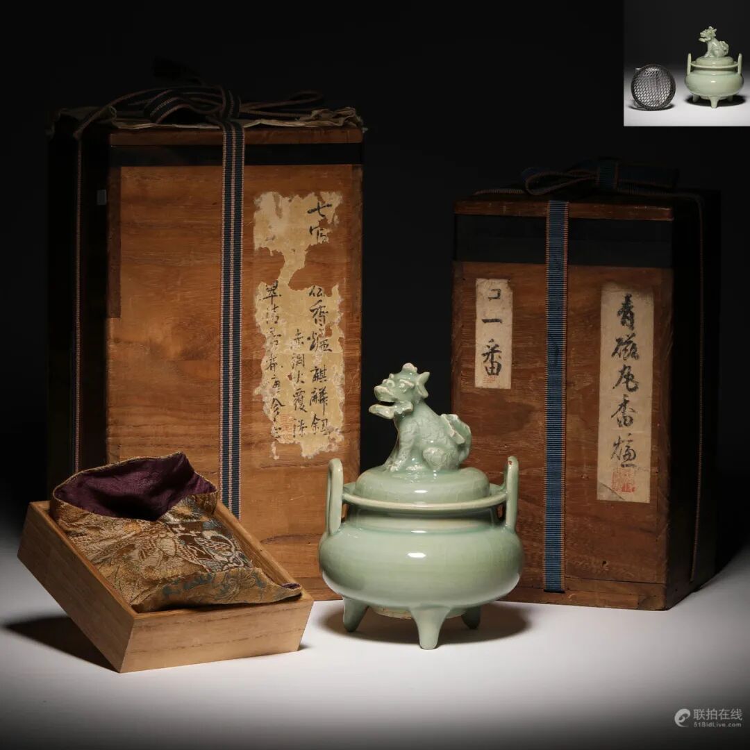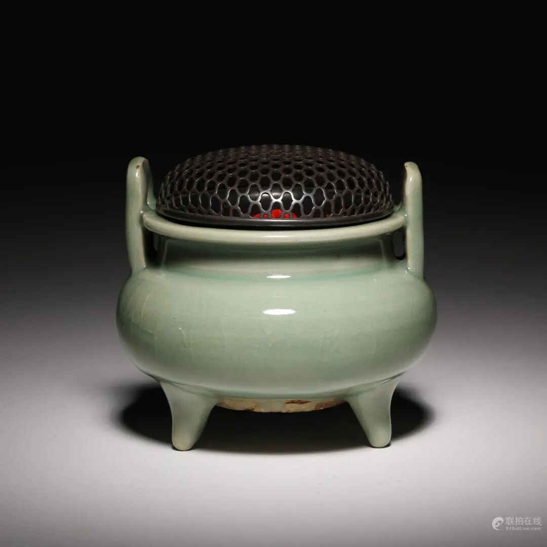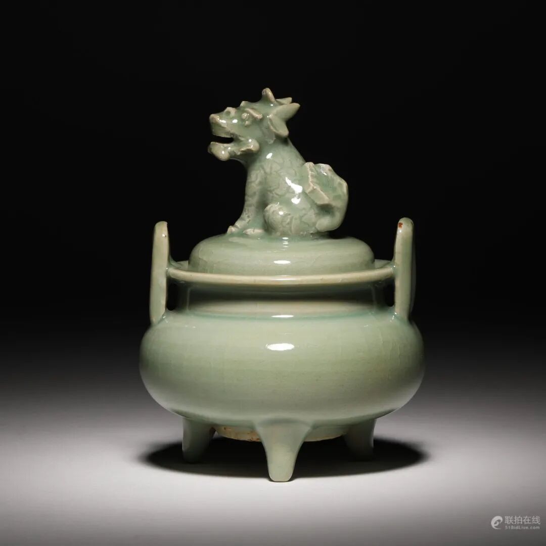 七官龙泉青瓷狮钮三足炉