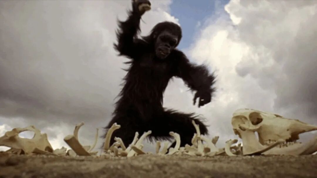 认为《2001太空漫游》是一部看不懂的影片,心满意足地拒绝寻找此片在瞬间的视听之外的意义,是一种退缩的表现。影片的美在于能够引发出阐释的可能,在于能够让人们追求能指的律令所带来的意义。笔者并非随意写下“心满意足”这几个字,因为影片确实极大地满足了人们想象的欲求。就好像弗洛伊德在去往月球的旅行中熟睡,空姐细心地照料他;就好像鲍曼在影片结尾的部分住在四星级酒店的套间中,衣食无忧地等待死亡;观众可以在影片中的具体时刻——影片上映时人们谈论最多的是《蓝色多瑙河》的片段——沉浸到影片的音乐和形式中。同时,影片中最著名的衔接,也可能是电影史上最著名的衔接——骨头被太空飞船取代——即使对于最懒惰的观众而言,都会引起他对于影片叙事意义的思考(赞美的、震惊的)。这意味着我们会试图建立两个镜头之间的关系,这种关系是建立在具体物体上的一种抽象的形式。在上述的衔接中每个人都会有自己的关于骨头和太空飞船的阐释:这种阐释至少是具有逻辑性的,即使是以否定的形式出现,也会发现骨头和太空飞船之间的相似性;不仅建立起相似性的联系,同样也有一种因果的联系,一种“押韵”,这种阐释是一种抽象的跳跃,就像大猩猩发现了工具一样。这种衔接本身就是一种抽象,在语言或者象征的宇宙中,这是一种绝对的不可逆转的跳跃。在衔接的影响下——这种衔接并非完全清晰——观众会觉得这个物体是一个工具、一个武器,人们之后开始进行发明创造。就好像在象棋中,这个平行六面体是车,这个更小的是兵。![]()