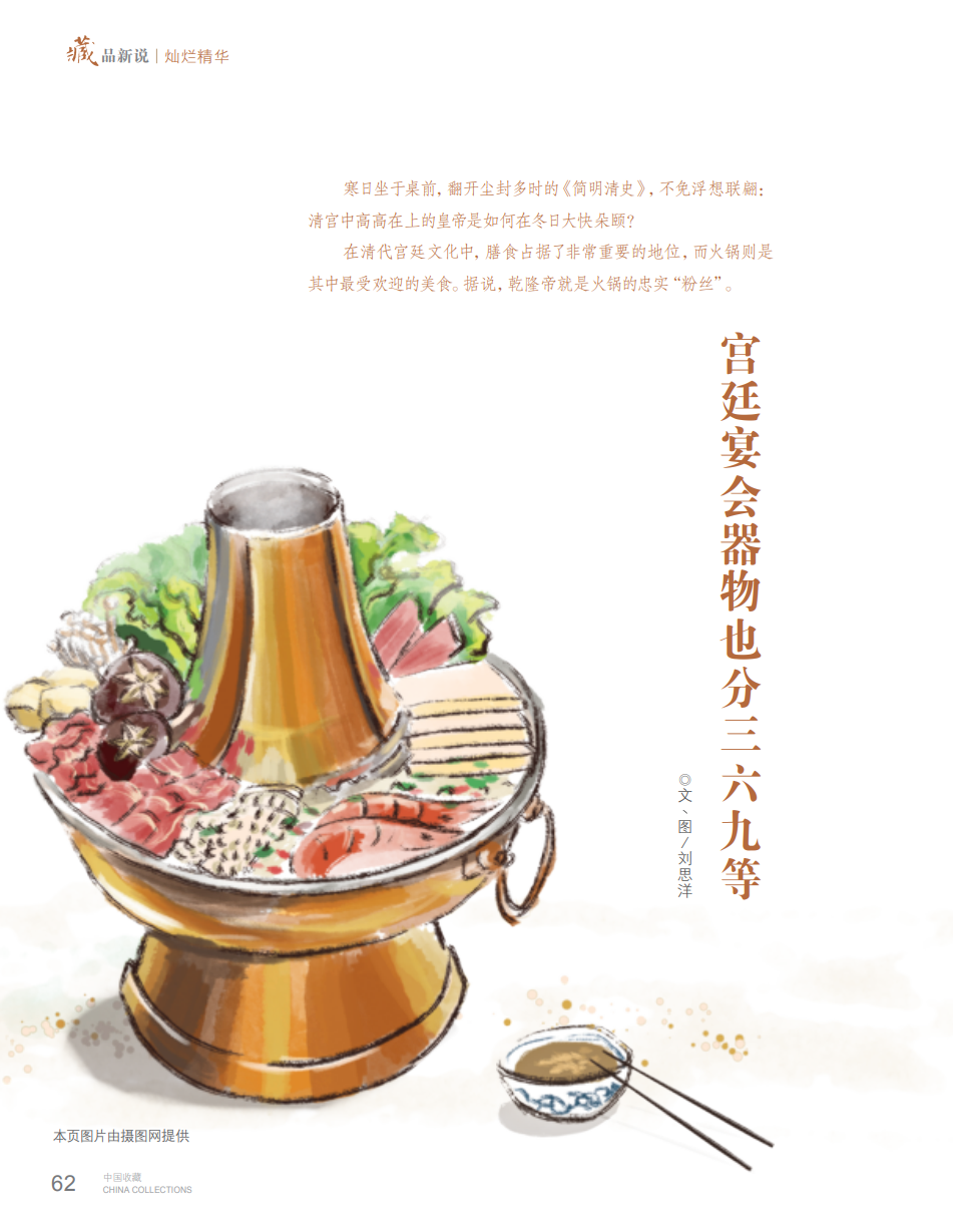 在清代宫廷文化中,膳食占据了非常重要的地位,而火锅则是其中最受欢迎的美食。据说,乾隆帝就是火锅的忠实“粉丝”。在乾隆时期盛行的千叟宴席上,也少不了火锅的身影。千叟宴席上看似统一的火锅实际上是有内宫的等级规制,分一等桌和次等桌,等级不同陈设也有所差别。
