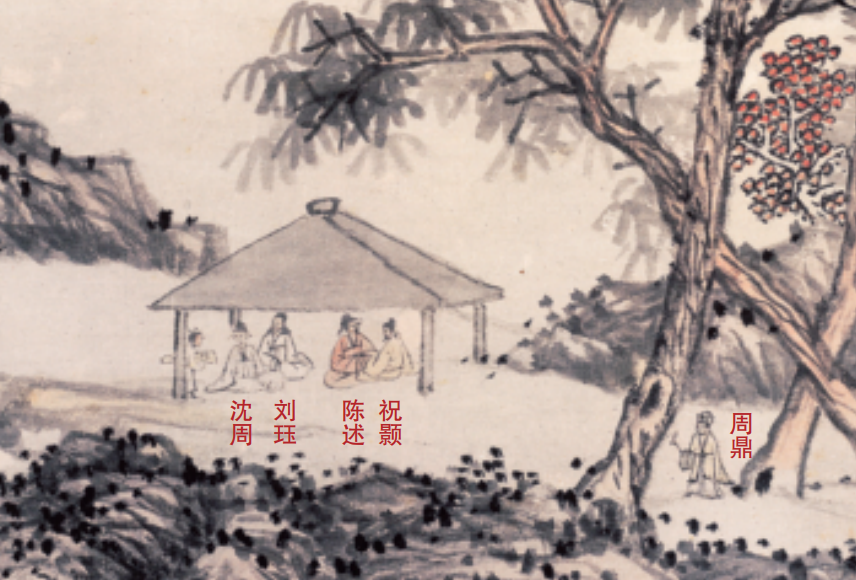 从《魏园雅集图》画面中看,虽然画面中人物体量很小、线条简约,但也突出刻画了各人的年貌特征,可以说是沈周对几位文士及自己的简约画像。在这幅描绘文人雅集的纪实性画作中,处处流露着沈周对元四家笔墨精髓的领悟。他将四家中每一位的笔墨特点都悉心于怀,最终形成了自身独具特色的画风。