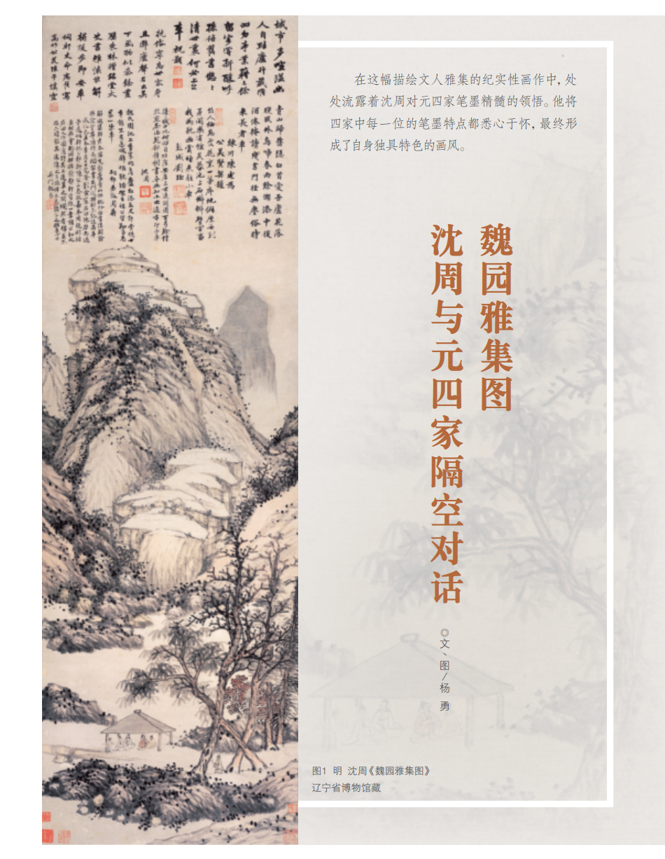 《魏园雅集图》为明代吴门画派领袖沈周于成化己丑年(1469年)所绘制,时年43岁。沈周家族世居吴门,其父沈恒吉、伯父沈贞吉均善诗画。沈周一生布衣,优游林下,为人敦厚,性情随和,是闻名吴中的贤达文士,也是吴门画派的宗师。