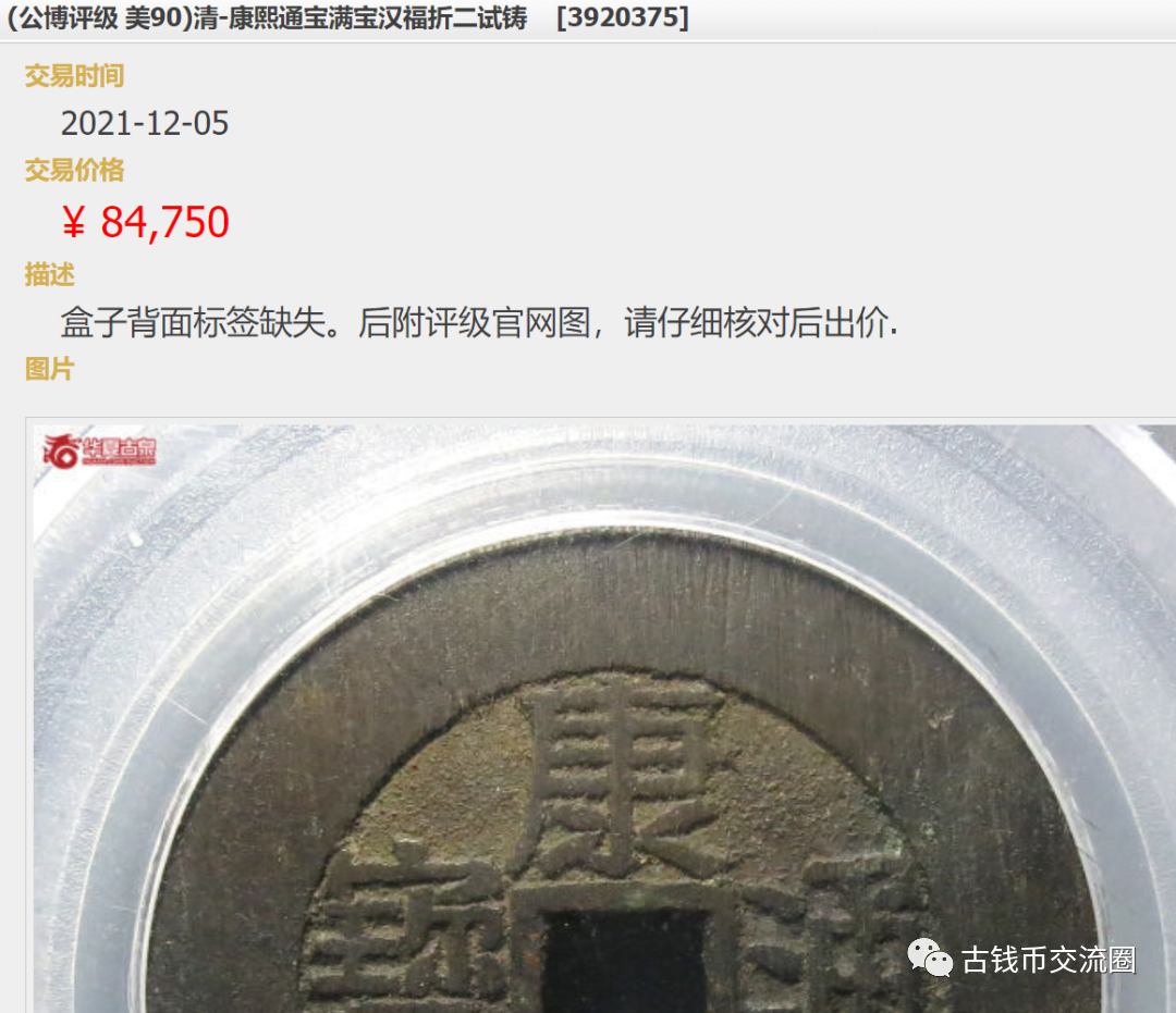 发禄也是我国独特的民俗艺术品,将铜钱编织成老虎头、蝴蝶、蝙蝠、寿桃、花篮等形状,悬挂于房梁正中或新床之上,寓意家人身体健康、夫妻恩爱、长命百岁等。因为保存的环境不同,包浆也各有差别,发禄包浆以传世黄亮居多,偏暗淡,而房梁则味道较重,残留物较多。但发禄钱也会偶尔出现极品帐钩锈、通体满绿等情况,在颜值时代贵了不少。学习了那么多满汉福的知识,大家是不是以为再出摊捡漏,随便就能淘到极品?那就错了,今天要讲的是教训。这位网友有一次去苏州玩,和朋友参加了一个小交流会,当时有位姓齐的古玩店老板,拿出一堆五帝钱版别供大家欣赏。其中,有一种康熙通宝“满宝汉福”折二试铸大样钱,背面满文“宝”字及汉文福局名,直径30mm,他说这种钱币特别罕见,是试铸样钱,少量流向民间。翁同酥故居就在常熟古玩市场,当年这里曾一次出过上千枚极品满汉福,老板花了很长时间,足足收集了8枚这样的试铸钱。古玩老板出价7800元,网友当时主要以其他古玩为主,对古钱币的知识都是点到为止,权衡了一下,最后网友选择了店里的一对康熙民窑青花瓷细路小罐,考虑良久花了9000元买下来,至于满宝汉福钱则放弃了。多年以后,网友看到华夏专场上个月拍出一枚“满宝汉福”折二试铸大样钱,卖了84750元,深感后悔。这枚试铸钱曾在2013年的上海崇源秋拍中,拍出了7410元的价格,然后在之前的华夏专场里拍出84750元的高价,八年时间,足足涨了11倍多!网友懊悔于当年没有做出更好的选择,如果几年前也买了一枚,现在也差不多可以赚个8~10倍了。而网友买的那对康熙青花瓷,后来缺钱1.2万卖掉,现在也涨到3万以上了。不得不感叹,当初一没看到试铸钱的潜力,二没沉住气把民窑精品留住,现在会这么后悔。说这么多,只是想与大家分享,有的时候,对精品的坚持与选择,比努力重要。最近微信改了推送规则,不是按照时间,而是按照你的阅读习惯推送,想要第一时间收到新推送,还麻烦右下角点个