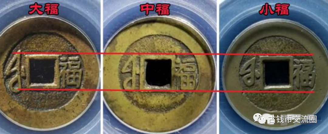 古钱种类繁多,要做到样样精,种种细,几乎不可能,毕竟人的精力是有限的,但在某一个品种里深耕,也能得到不少的收获。就像康熙满汉福,康熙通宝背满汉文因为好认,很受玩家追捧,一首诗就可以总结:同福临东江,宣原苏蓟昌,南河宁广浙,台桂陕云漳。如果不讲究钱式和版别,集齐这二十局并非难事,但如果想收集原版大样等精品,那难度可就高了。同样的,精品因为稀有,懂这方面知识的人少,很多人就把其中一些特殊的版本当做普品来卖,如果你懂行,就能捡到漏。有位藏友自述多年前的一件趣事:数年前去江苏南京走亲戚,在网上询问哪里有淘宝的地方,朋友留言让他去苏州,还把自己捡漏的经历告诉了他,上次100多买到了康熙满汉大福宝下月版,转手就卖了一千多。因为时间紧网友没去成,但别人捡漏赚钱一事还是让他记在了心上。网友回合肥后就跑到城隍庙古玩市场逛了一圈,花了260元买了一枚满汉福。虽然是真品,但查资料才发现是普通小福,品相还烂,被宰了。网友不服气,恶狠狠的补习了一下知识,才知道宝福局分为小福、中福、大福三种,其中大福最贵。下图可以一眼区分,区别在于背面满文福字会不会超出内郭。后来网友陆陆续续又学了很多版别,像小福的单点通、双点通、平足、折足之类的。后来看了朋友发的图片,再去学习相关知识,才知道这种月牙形状的点竟然是炉记,炉记就是工匠师傅刻下的一种记号,用以分清楚炉别、班次,到现在就成了提升价值的版别。所谓“宝下月”,就是正面宝字下面那个月牙儿形状的点,阴刻就是“阴版”,凹下去的,阳刻就是“阳版”,凸起来的。满汉福的用途还有用作房梁钱,以及民间的工艺品发禄。房梁钱主要来自江浙一带,新屋落成后,将铜钱用红布或红纸包好置于房梁之上,祈祷家宅平安。