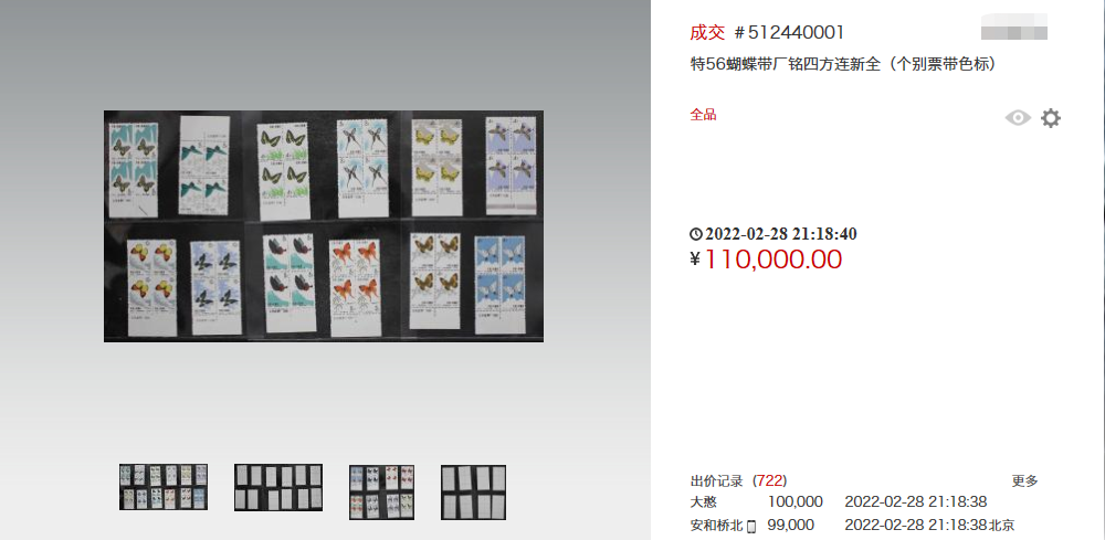 有一套带厂铭的蝴蝶四方连在网上以11万元高价成交。