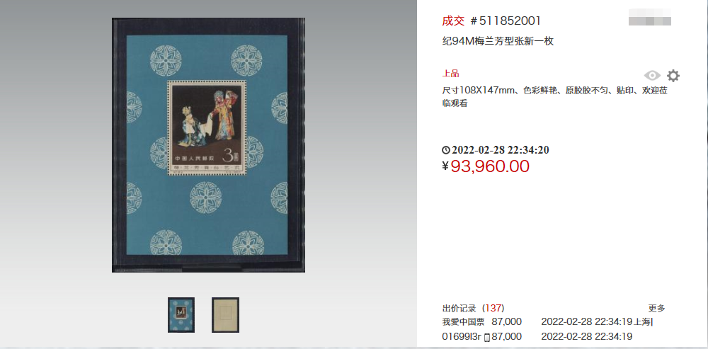 前些天网上,一枚梅兰芳小型张以93960元高价成交。