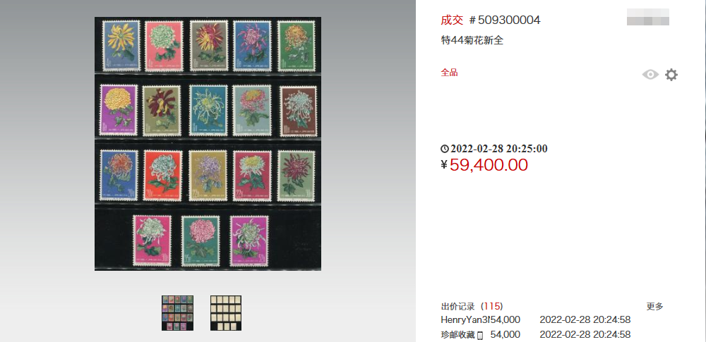 一套全新的《菊花》在网上以5.94万元高价成交。
