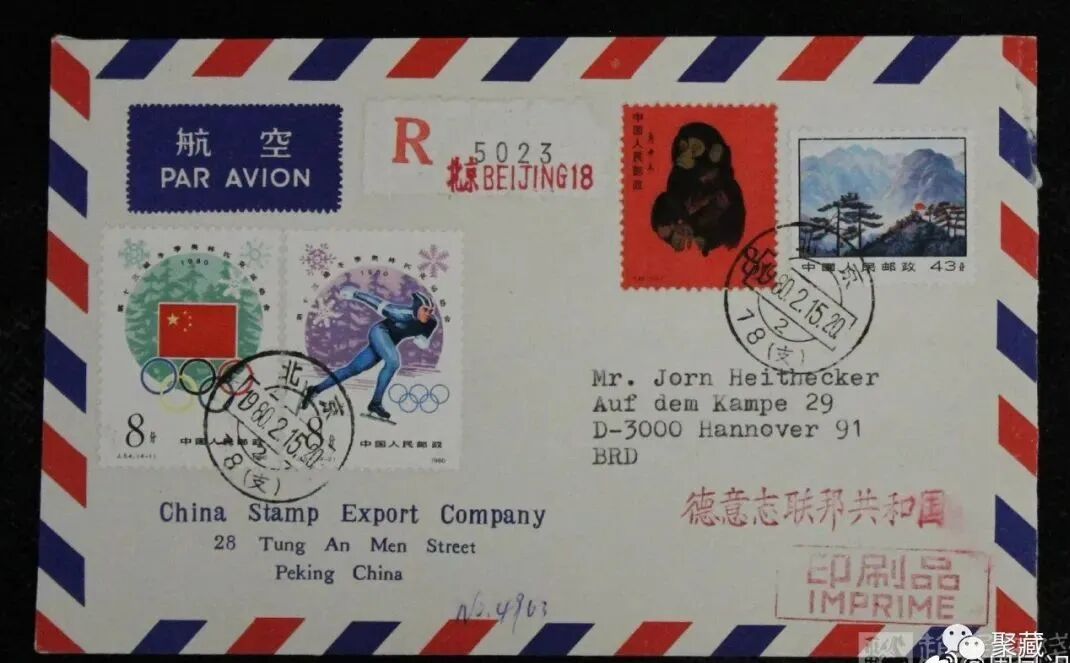T46“庚申猴”首日实寄封[1980年北京航空挂号寄德国封一件,贴T46“庚申猴”、J54“冬奥会”各一套、普14“革命圣地图(3)-43分”一枚,销2月15日北京戳]拍出,成交价为16206元。