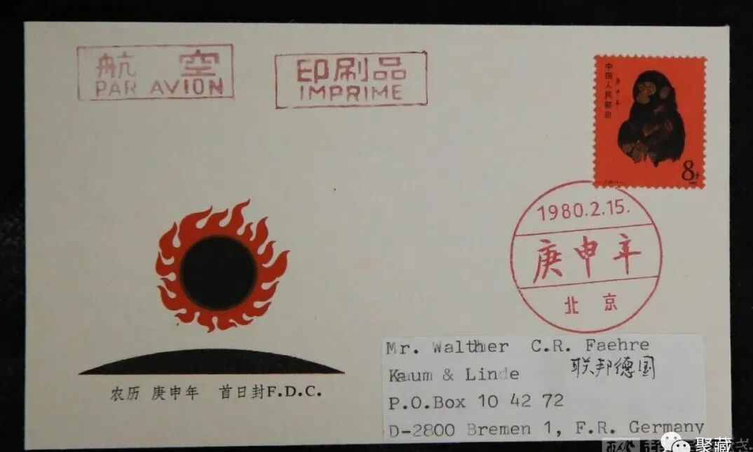 T46“庚申猴”总公司首日封实寄封:北京航空印刷品寄德国一套,贴普18“工农业建设图-5分”、特60“金丝猴(3-3)”各一枚,销2月15日北京戳,拍出成交价为40515元。