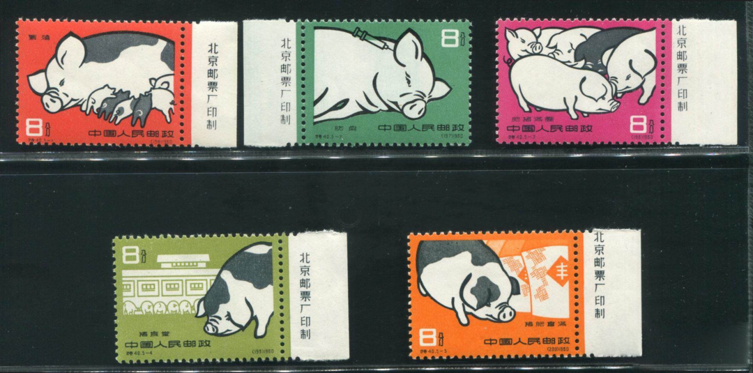 1960年,为庆贺养猪业取得的成就,邮电部发行特40《养猪》邮票一套5枚,票名分别为"繁殖"、"防疫"、"肥猪满圈"、"猪食堂"和"猪肥仓满"。