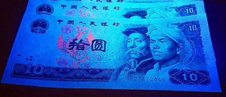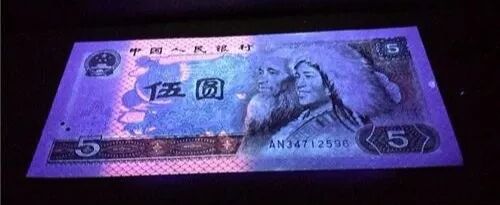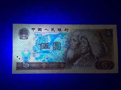 805即80年5元纸币。荧光下票面蓝色的荧光仙鹤,颜值满分!