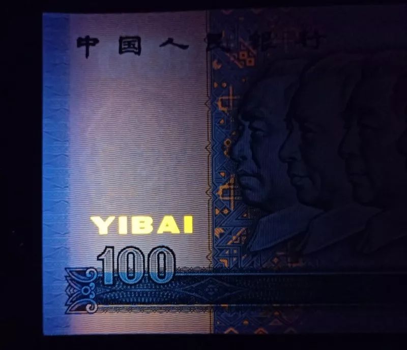 90年的100元纸币。作为四版币中面值最大的一张,荧光效果反而没那么强了。