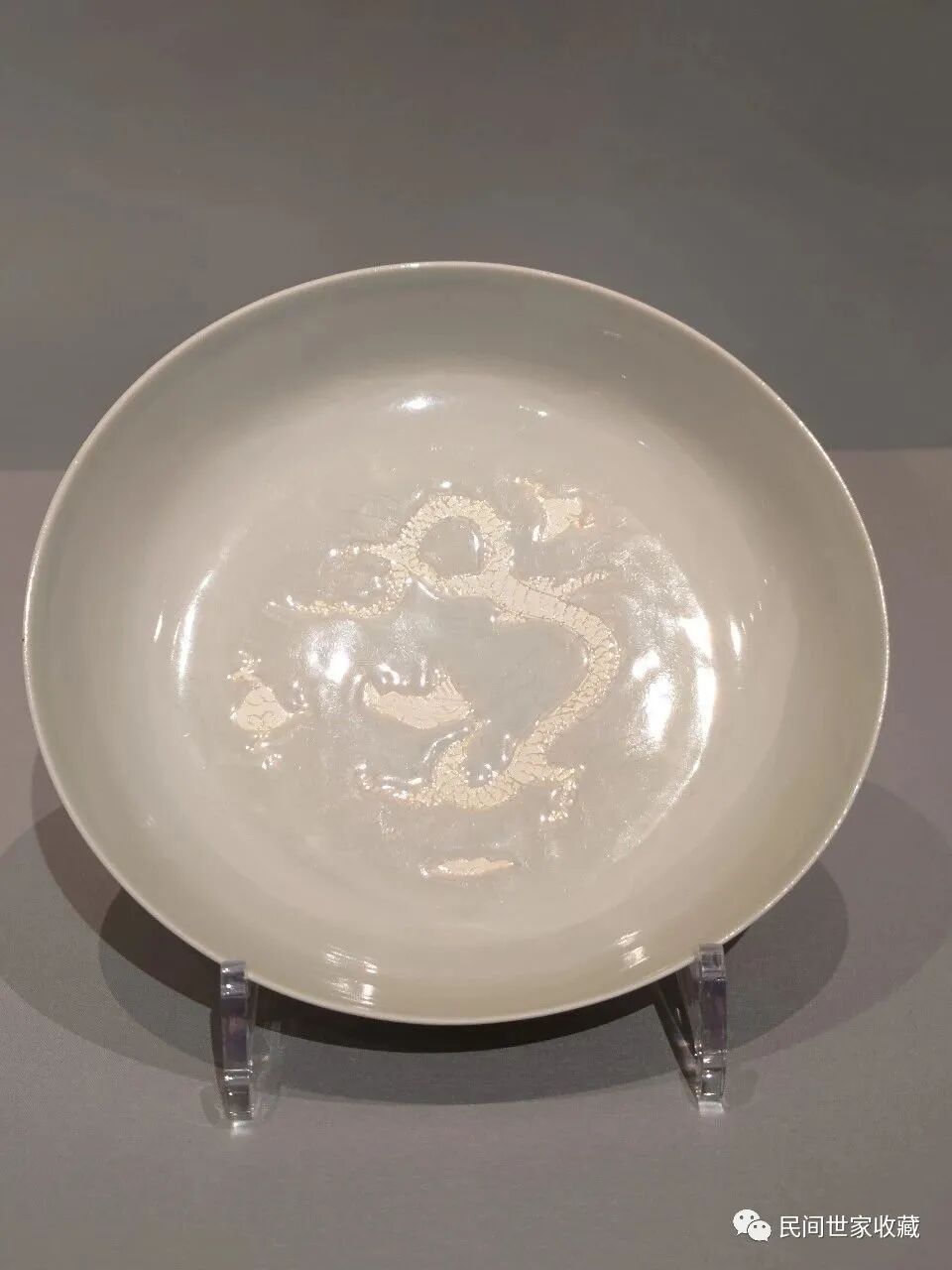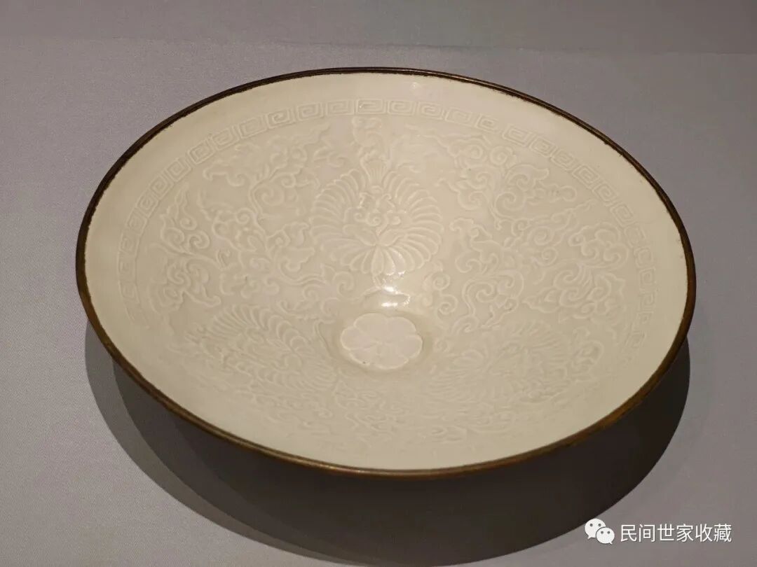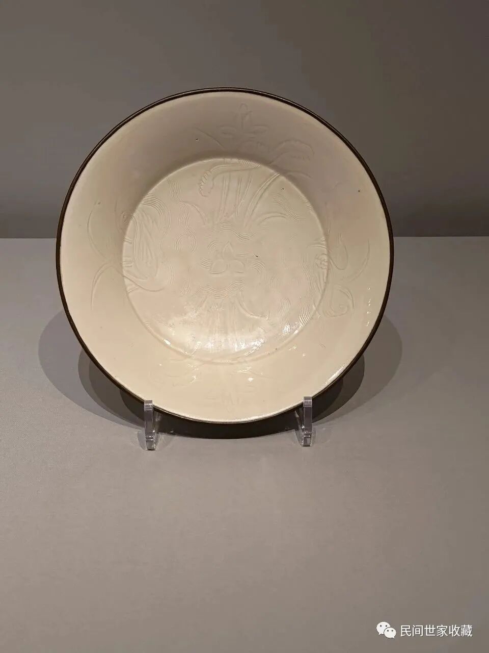 此件定窑白釉刻荷塘鸳鸯纹盘呈色象牙白,釉面莹润,刻花线条流畅有力,将荷叶的阴阳向背的翻卷关系都很灵动的表现出来了,同时采用篦划纹来描绘湖面的水波纹,颇有波光粼粼的动感,口沿一圈老镶口显示出经久的岁月传承包浆,是一件保存完好且难得的定窑系白瓷精品,断代方面,个人认为应该是在北宋晚期到金代初期这段时间比较合适,展览方也是定在宋金两代之间。