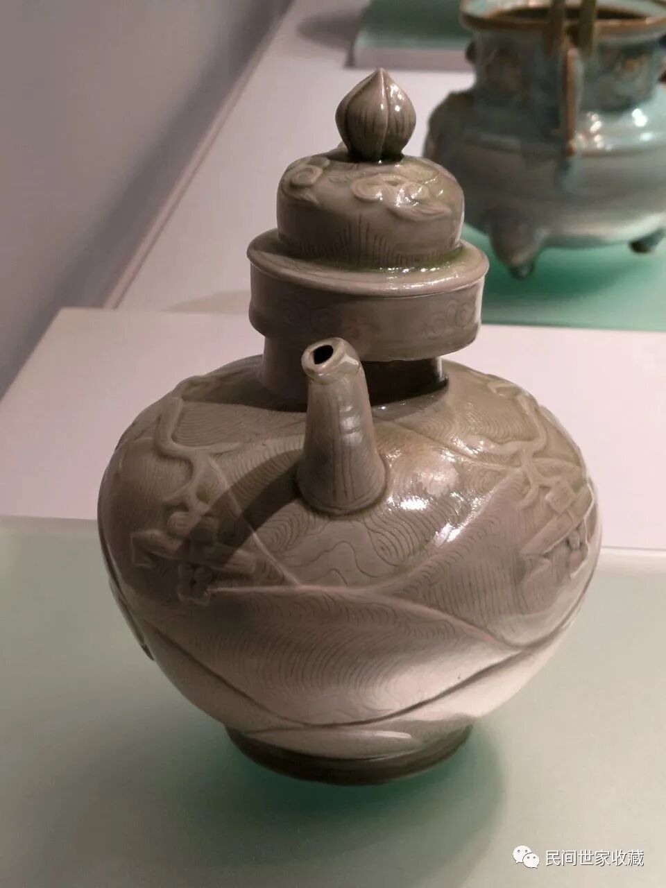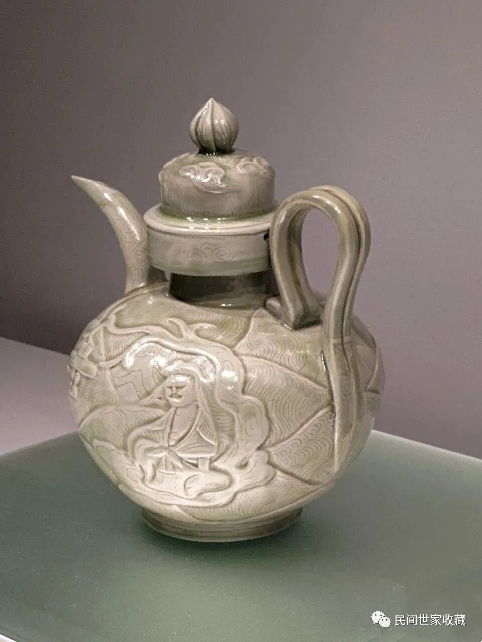 此件刻画执壶,初看以为是北宋的耀州窑刻花产品, 展方却定为晚唐五代时期的越窑青瓷产品,由此可见早期越窑系青瓷的胎釉及刻划花装饰工艺对后期北宋耀州窑的影响和渊源关系。此件执壶满刻工装饰,且出现有佛道人物形象纹,更为难得。