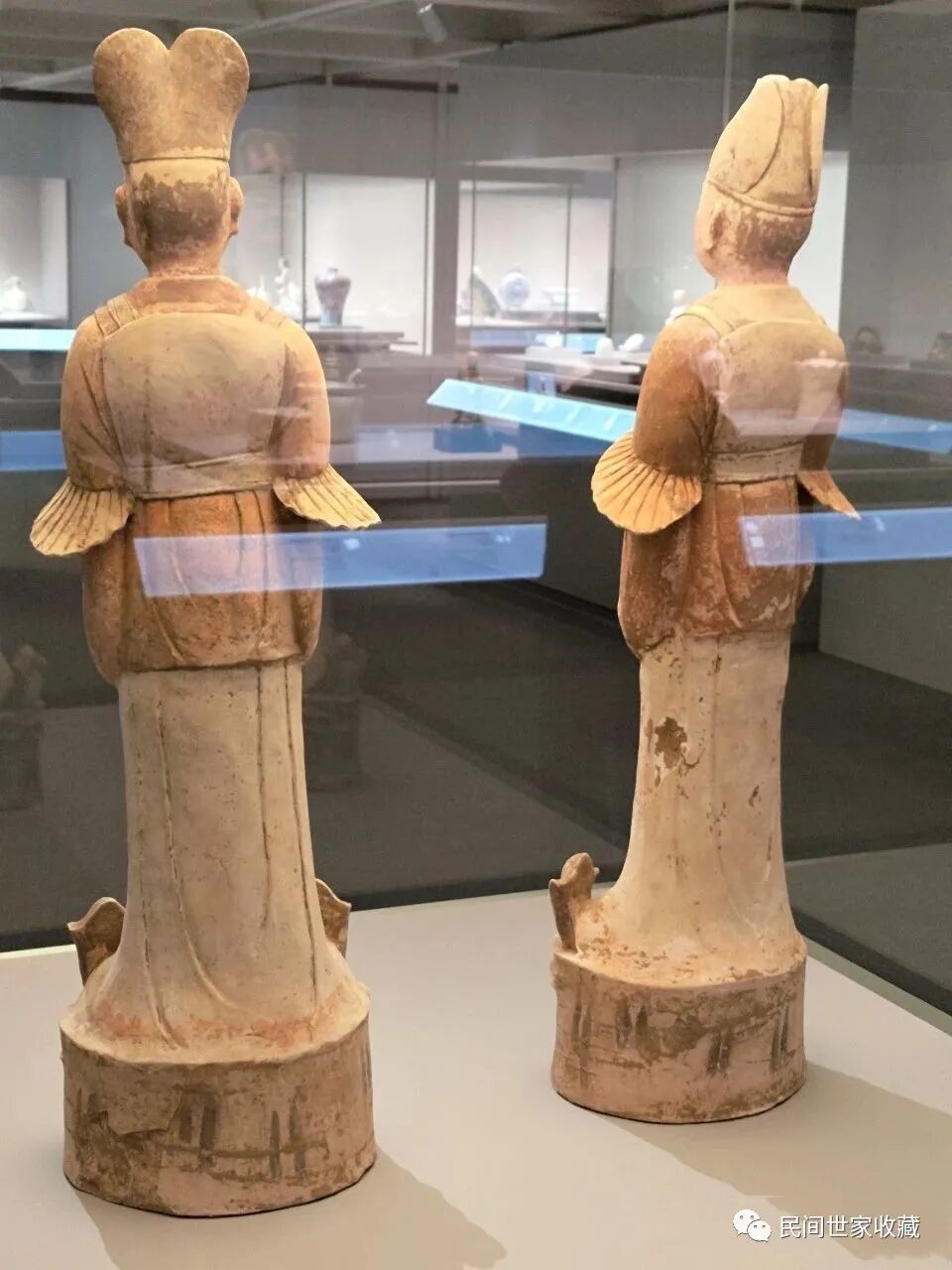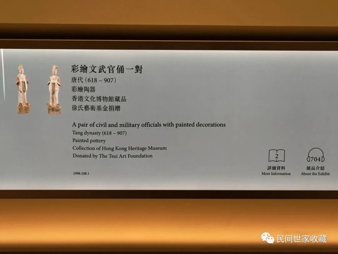 这对唐代的彩绘文官俑器型高大,目测有四五十厘米高,品相保存较好,人物开脸雍容富足,身形高大魁梧,展现出盛唐时期大唐帝国的盛世风韵。原为香港著名收藏家徐展堂的旧藏,后捐献给了香港文化博物馆收藏。