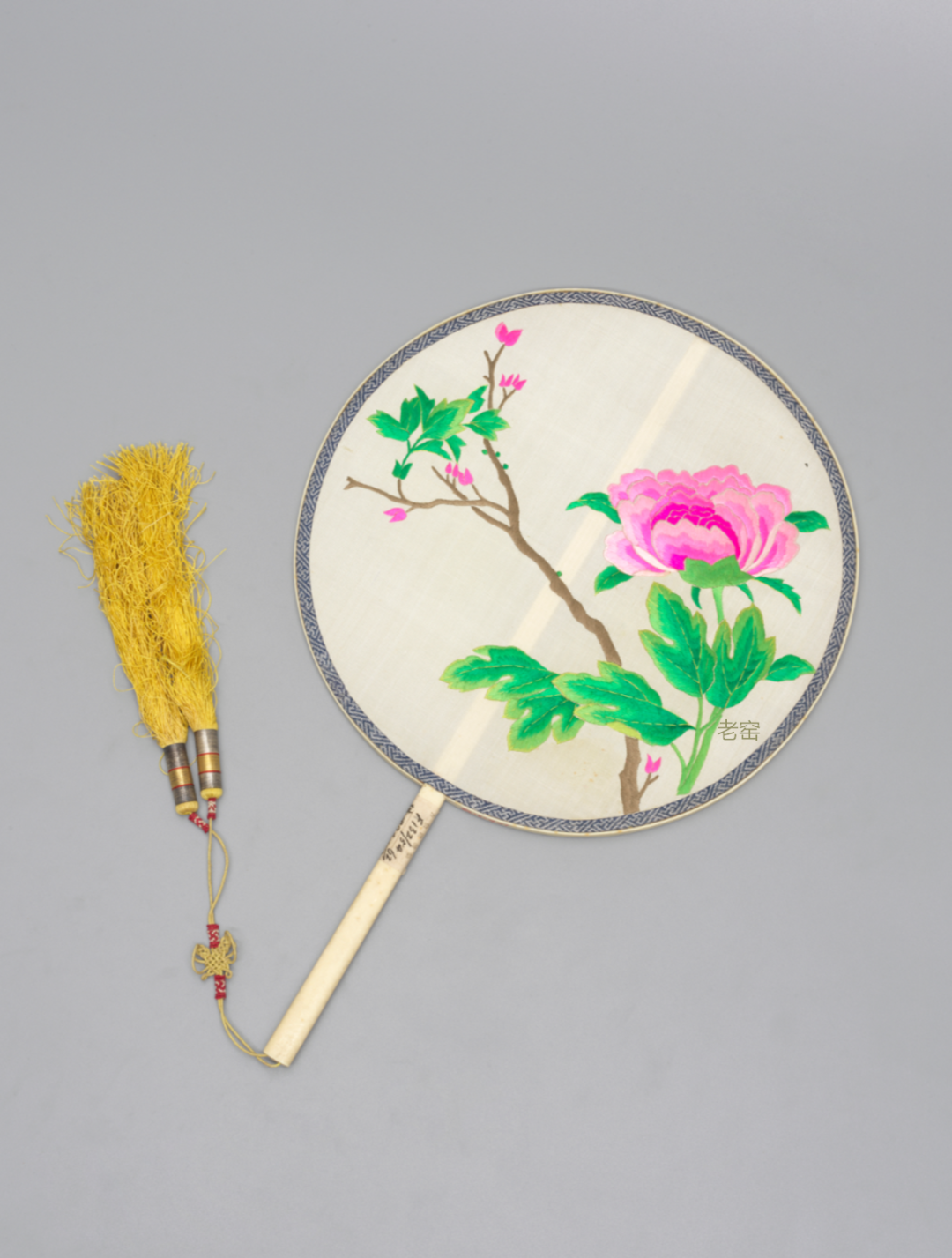 清代 白色绸绣牡丹花图面象牙边柄团扇