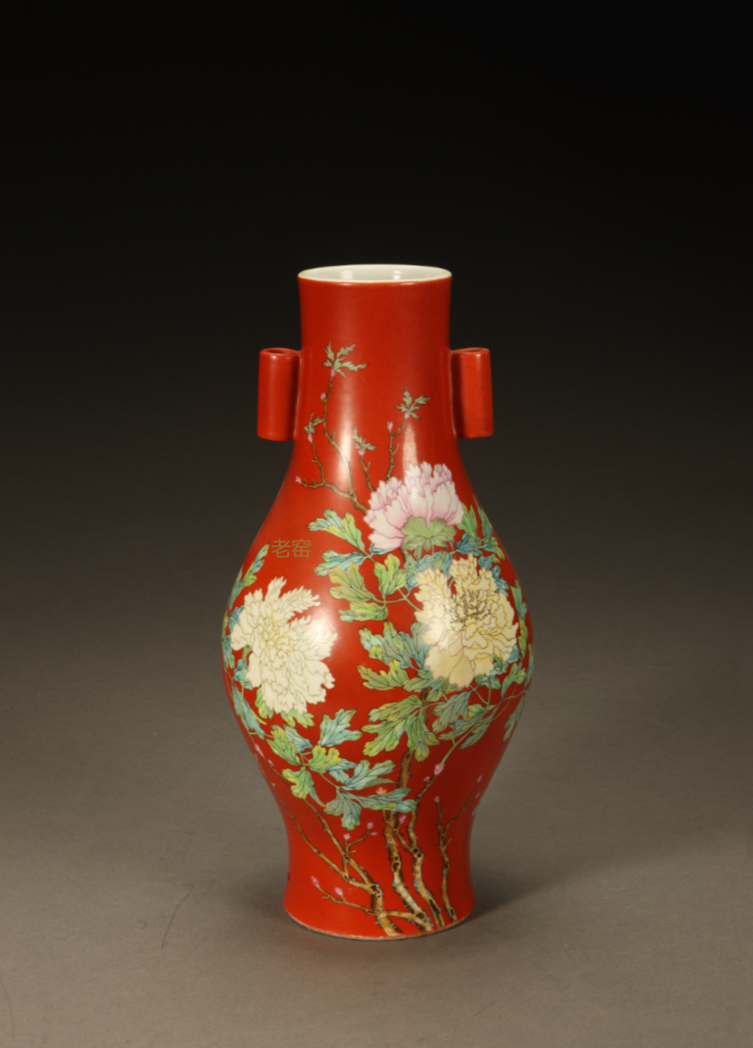 清代 珊瑚红地粉彩牡丹纹贯耳壶
