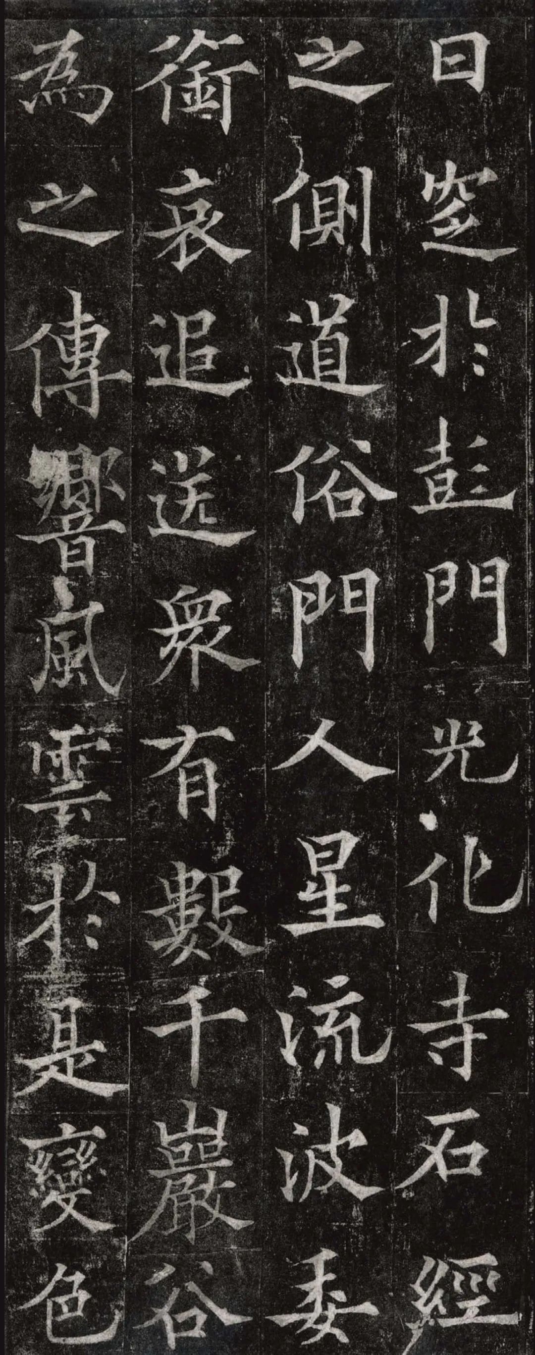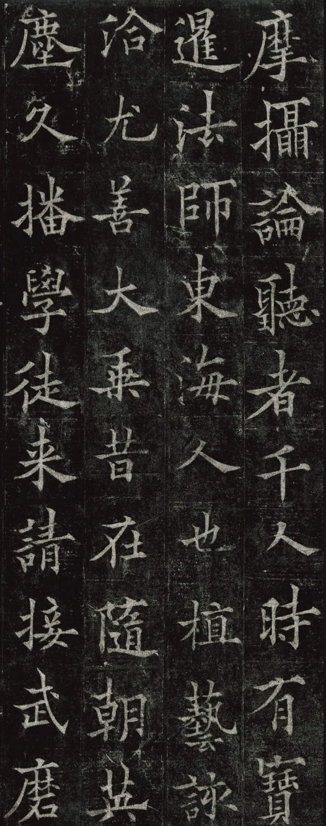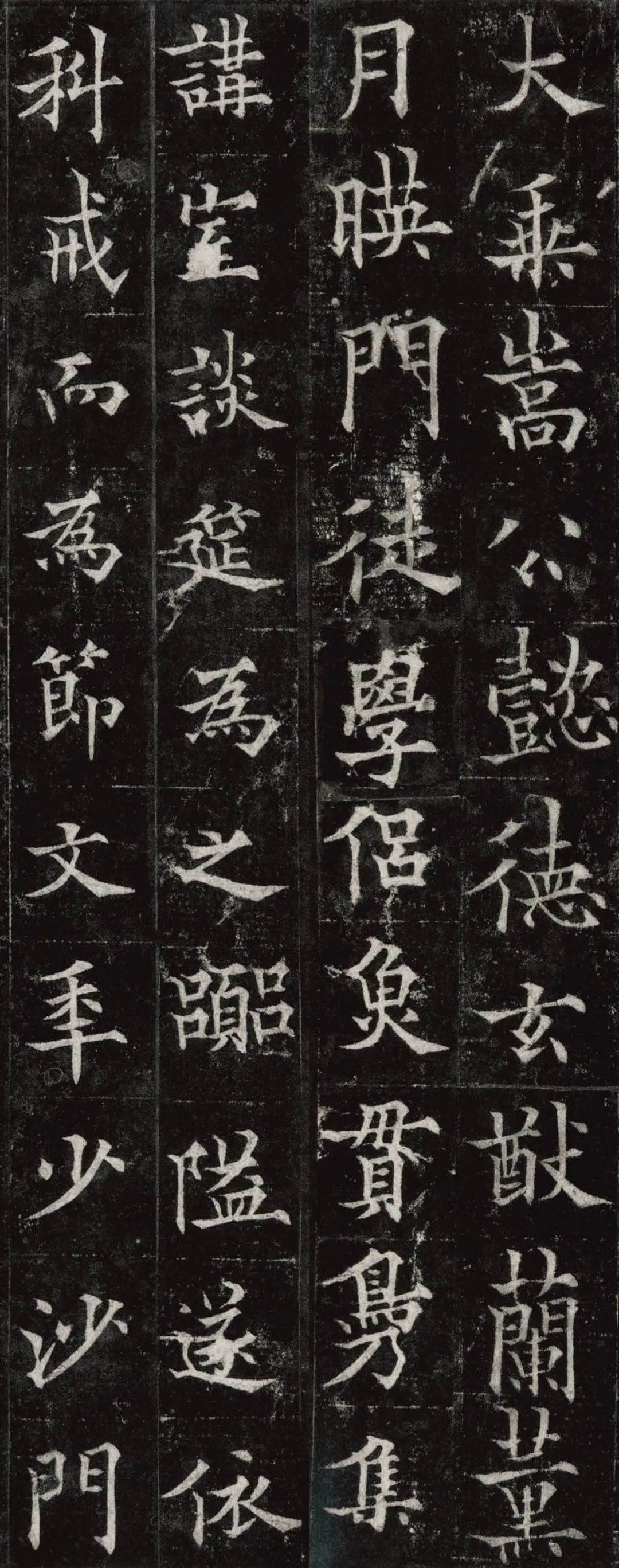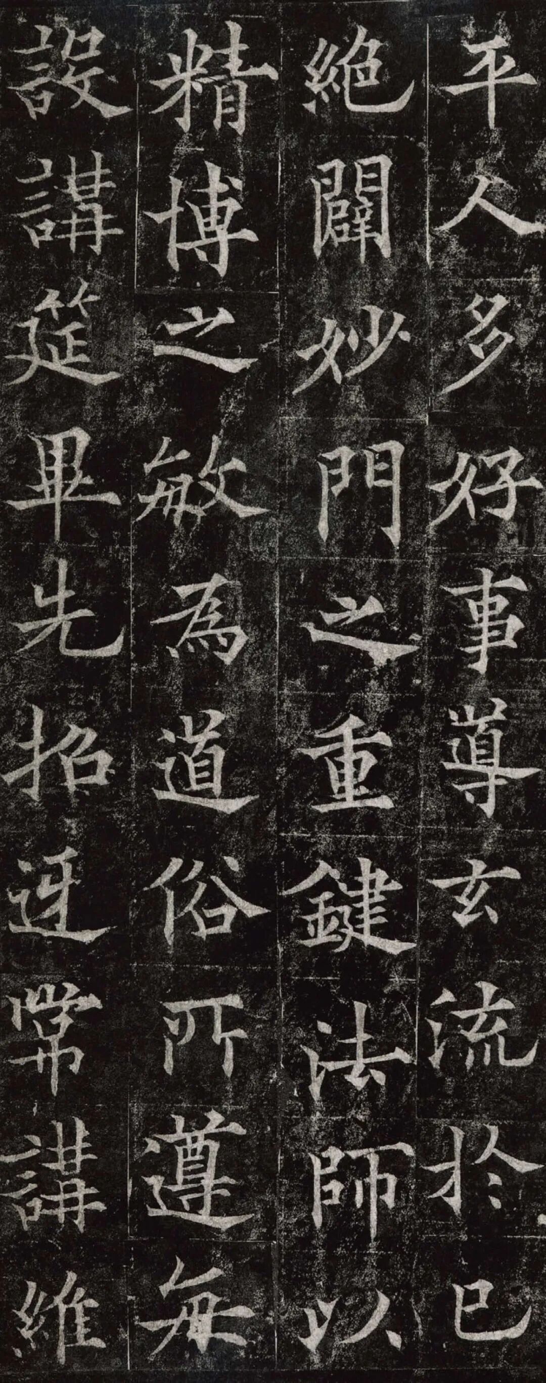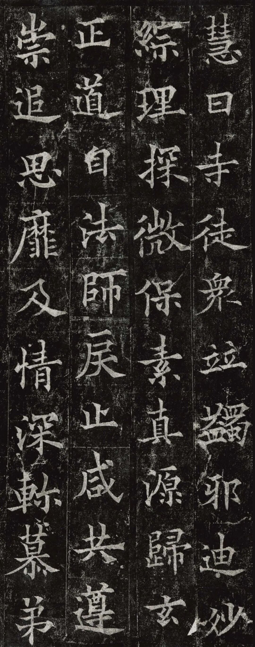 欧阳通,字通师,潭州临湘(今湖南长沙)人,欧阳询第四子。累官中书舍人,殿中监,司礼卿,判纳言事,封渤海县子。后因反对武承嗣为太子被杀。新旧《唐书》有传。欧阳通童年时期,父亲便过世了,母亲徐氏教他学习父书,锐志赞研,刻意摹习,得以继承家法,得询劲锐而险峻过之。成为唐代著名的书法家,与其父欧阳询齐名,有“大小欧阳”之称。欧阳通学书时期,正当初唐书法发生变化的时期,而他以“善学父书”著称。《道因法师碑》,全称《大唐故翻经大德益州多宝寺道因法师碑文并序》。李俨撰文,欧阳通书,华原县常长寿、范素镌刻。唐高宗龙朔三年(663)建。碑高320厘米,宽140厘米。正书,34行,行73字。碑额正书“故大德因法师碑”七字,额字小且横书,比较少见。碑头雕为螭首,碑额处雕饰佛龛,及释迦牟尼、观自在、大势至三佛像,是唐代浮雕极有特色的精品。碑文文字完整,基本无缺损。碑石现存西安碑林。欧阳通书法,出于父,写得更瘦硬,更劲挺,特别是主笔横画在收笔时末锋飞起,富有浓重的隶意,这在此碑帖中多有体现。宋董迪《广川书跋》评云:“通笔力劲险,尽得家风。”朱长文《续书断》以为:“虽得询之劲锐,而意态不及也,然亦可以臻妙品矣。”按,通早孤,未得乃父亲炙,书法由母徐氏指导,蒐讨父迹,力学不倦,纵有异同,或谓不及,亦自在情理之中。明王世贞《弁州山人稿》评其书 “《道因碑》如病维摩,高格贫士,虽不饶乐,而眉宇间有风霜之气,可重也。”杨守敬《平碑记》评价:碑森焉若武库矛戟”,正是指字里行间所流露出的刚直不阿的气概,可谓书如其人。汪珂玉《珊瑚网》“瘦怯于父而险峻过之”。清何绍基称此碑“险劲横铁,往生育突过乃翁”。杨士奇《东里续集》“矩蠖森严,意态飘逸,但少含蓄之趣耳”,故以“风霜之气”为喻。叶昌炽《语石》评云:“《果道因法师碑》戈戟森森,锋颖四出,六朝淳古之气,浇漓尽矣。盖能得之《皇甫碑》之险峻,而无《化度》之淳蓄,非善学率更者也。余谓小欧,但传其父分隶法。”