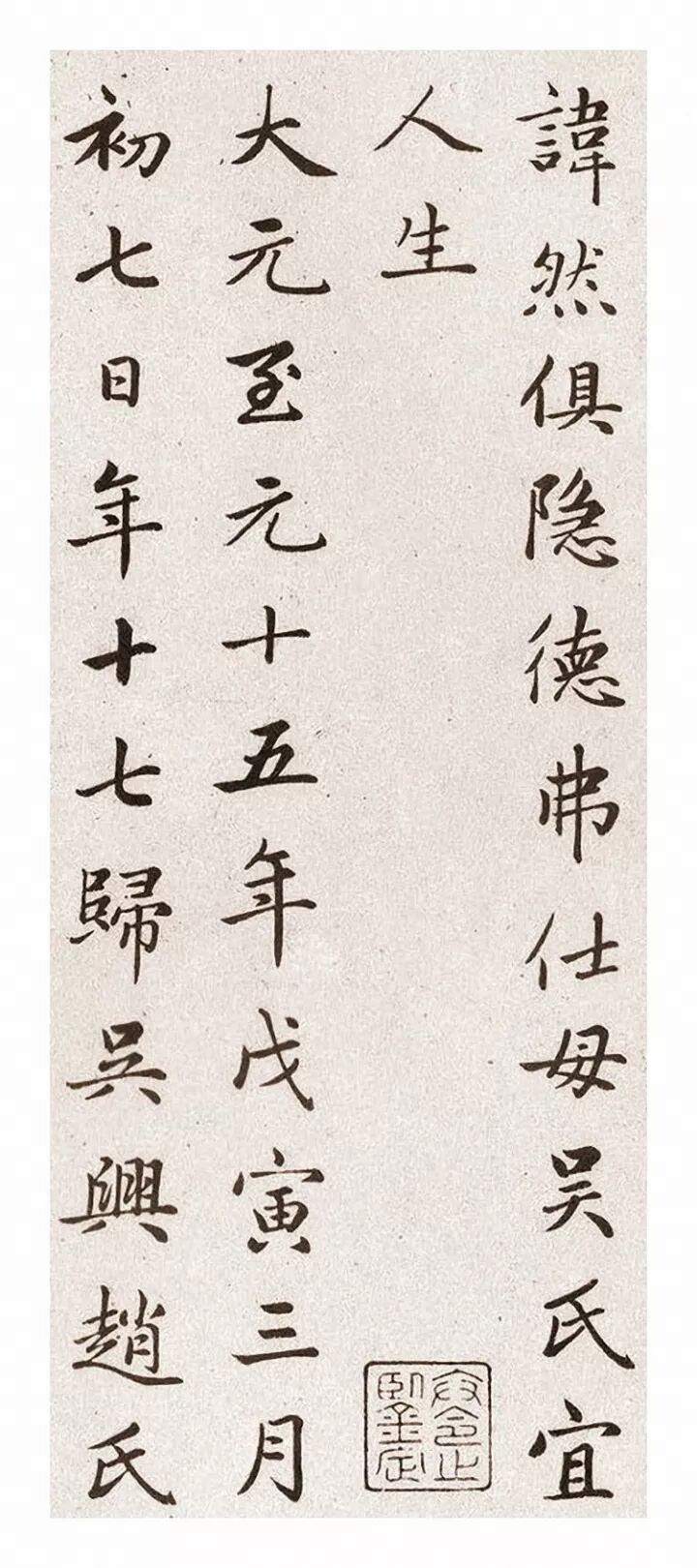 宜人姓衛氏。諱淑媛。世居崑山石浦。曾祖諱洽。宋進士及第。脩職郎。故參政魯國文節公諱涇之母弟也。祖諱楠。父諱然。俱隱德弗仕。母吳氏。宜人生大元至元十五年戊寅三月初七日。年十七。歸吳興趙氏。為承務郎松江府判官府君諱由晨之妻。從仕郎太平路繁昌縣尹諱孟頖之冢婦。集賢大學士榮祿大夫柱國魏國公諱與訔之孫婦。資善大夫太常禮儀院使上護軍吳興郡公諱希永之曾孫婦。至順三年壬申。以府君官從仕郎。封宜人。善女紅。涉獵經史。事舅致孝。相夫教子。各盡其道。處妯娌以和。御奴僕莊而慈。撫育諸孫。愛訓兼至。主饋承祀者七十年。府君終于至正五年乙酉。後十九年。當至正二十三年癸卯潤三月。感瘧疾。醫禱罔效,四月初十已酉。終于歸安縣崇禮鄉建德里之寓舍。亭年八十有六。子一人。肅。將仕佐郎前松江華亭縣務稅課大使。孫男六人。桐生。前鄉貢進士溫州路宗晦書院山長。柯生。湖州路德清縣典史。松生。柱生。梓生。椿生。孫女四人。德生。適褚弼。寧生。適倪思齊。歸生。適陳謙善。止生。適陳升善。曾孫男四人。燁。炳。煥。燦。曾孫女四人。貴貴。端端。閏奴。復奴。府君墓在烏程縣霅水鄉趙灣霞坡原。道阻。弗克合葬。孤哀子肅忍死。卜是年七月初六日癸酉。奉柩權葬寓舍西北梁山之原。事嚴未暇乞銘。謹誌歲月納諸幽。